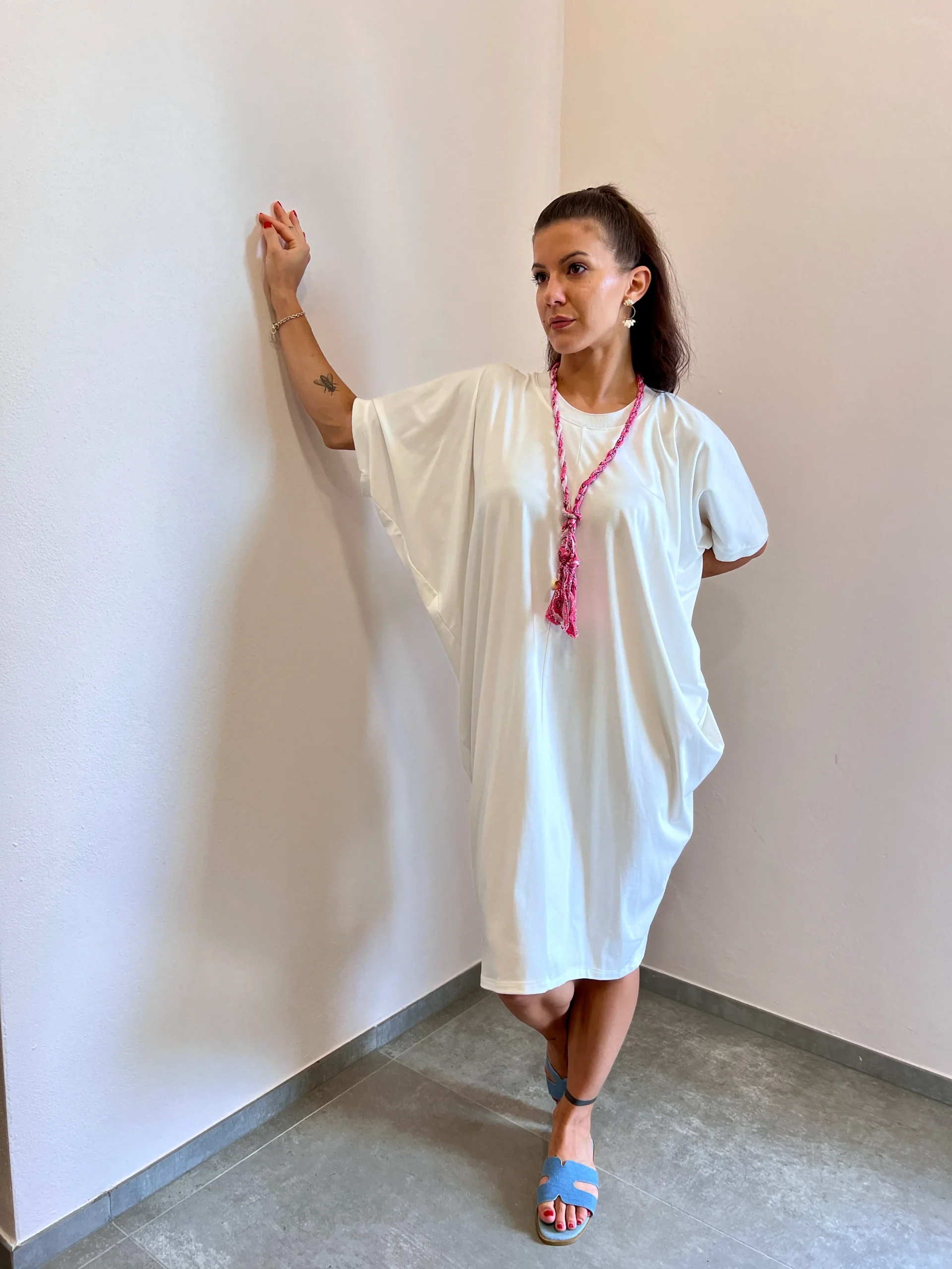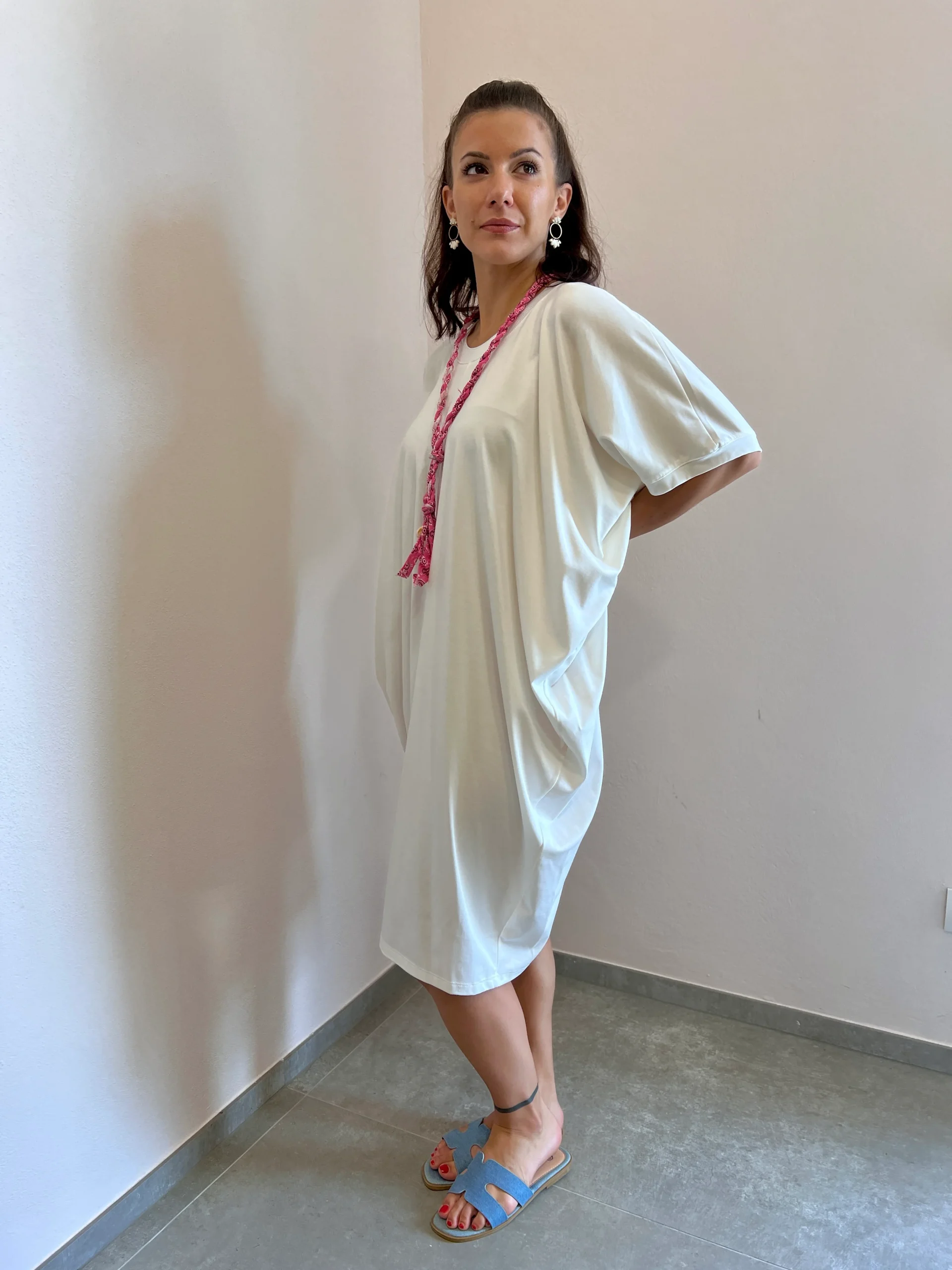 Abito leggero a girocollo , arricciato nei laterali , manica corta. Modello morbido, tessuto fresco.