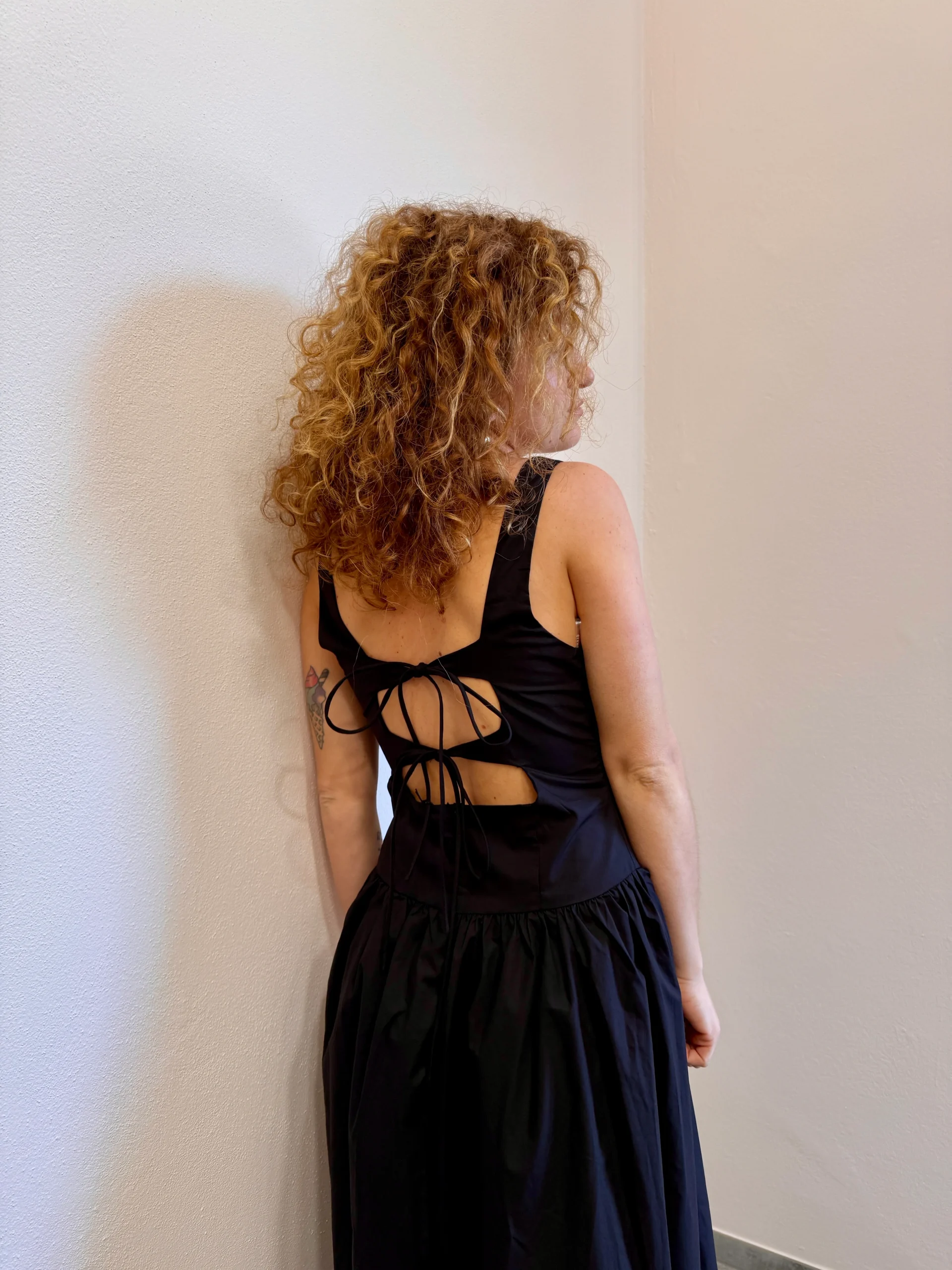 Abito in popeline leggero. Particolare per la sua allacciatura dietro la schiena leggermente aperta. Scollo quadrato sul davanti, effetto bustino sul busto. Gonna ampia morbida .