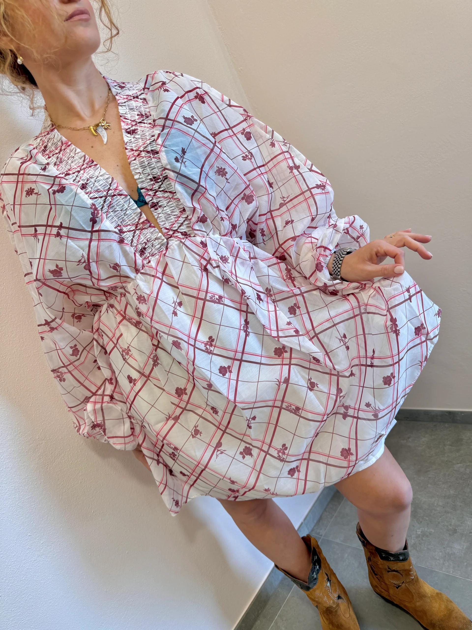 Abito check con fantasia Fiori, scolla V arricciato con l’elastico in vita manica lunga a palloncino, tessuto coprente sulla parte della gonna. Effetto morbido.