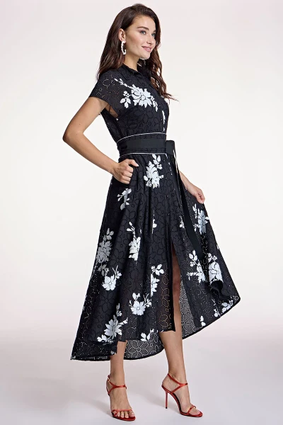 Abito svasato modello chemisier dalla lunghezza midi, in cotone nero con ricami intagliati, fustellato con paillettes ricamate a fiori a contrasto.Collo camicia con chiusura anteriore con bottoni centrali, tasche laterali inserite.Maniche con giro sceso, vita aderente arricchita con nastro abbinato da annodare in vita, orlo asimmetrico.Foderato.100% CotoneCodice: 3414-20