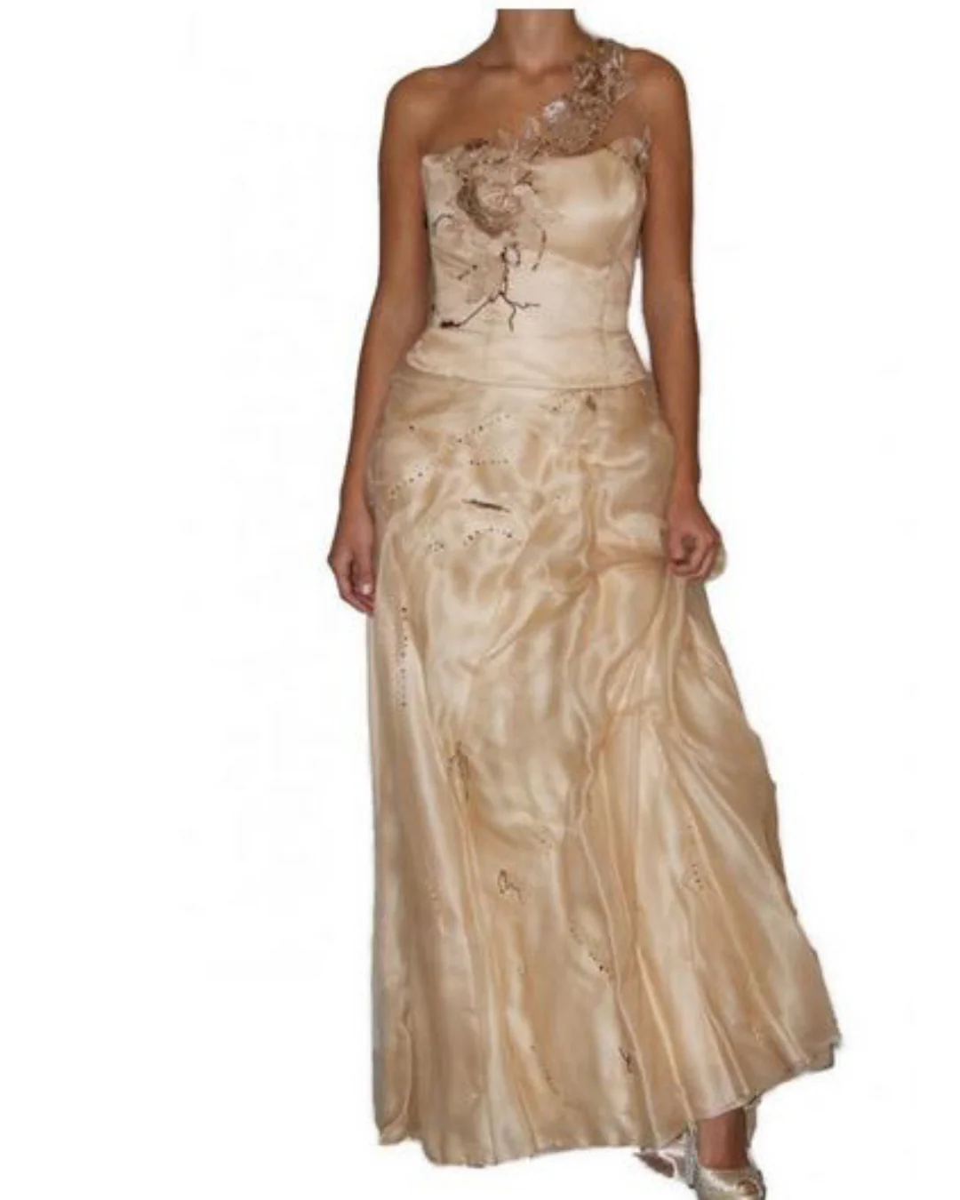 Abito composto da corpetto con scollo asimmetrico, impreziosito da ricami color pastello e perline in tono.Gonna ampia doppiata in tulle e seta.100% SetaCodice: 70AB12/01
