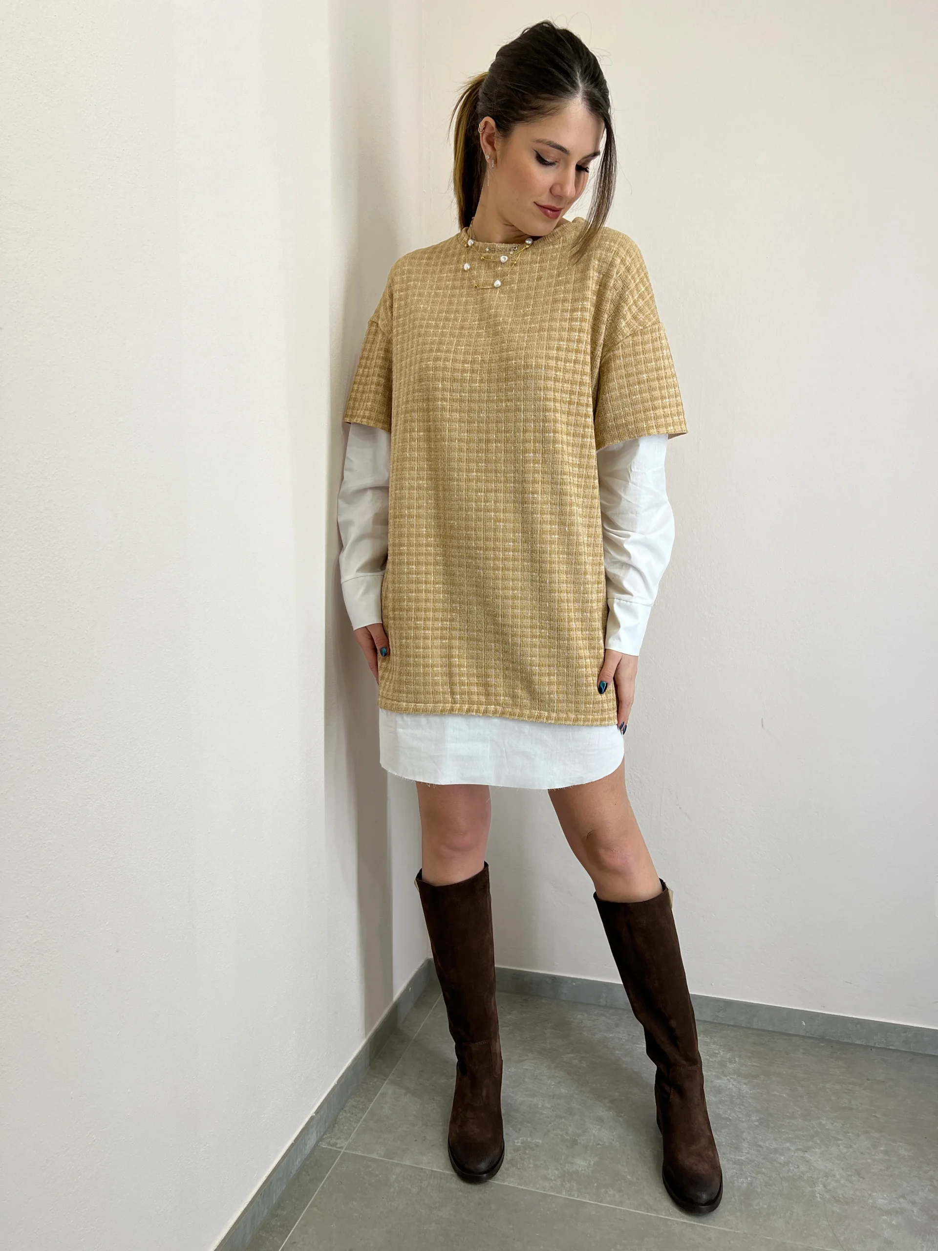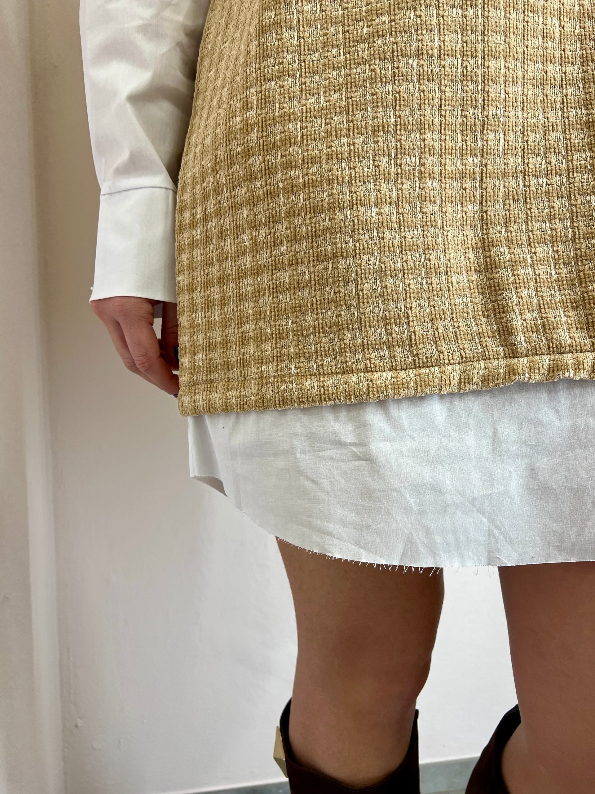 Abito in tessuto felpa effetto velluto . Doppi tessuto camicia nelle maniche e sul bordo . Taglio vivo.