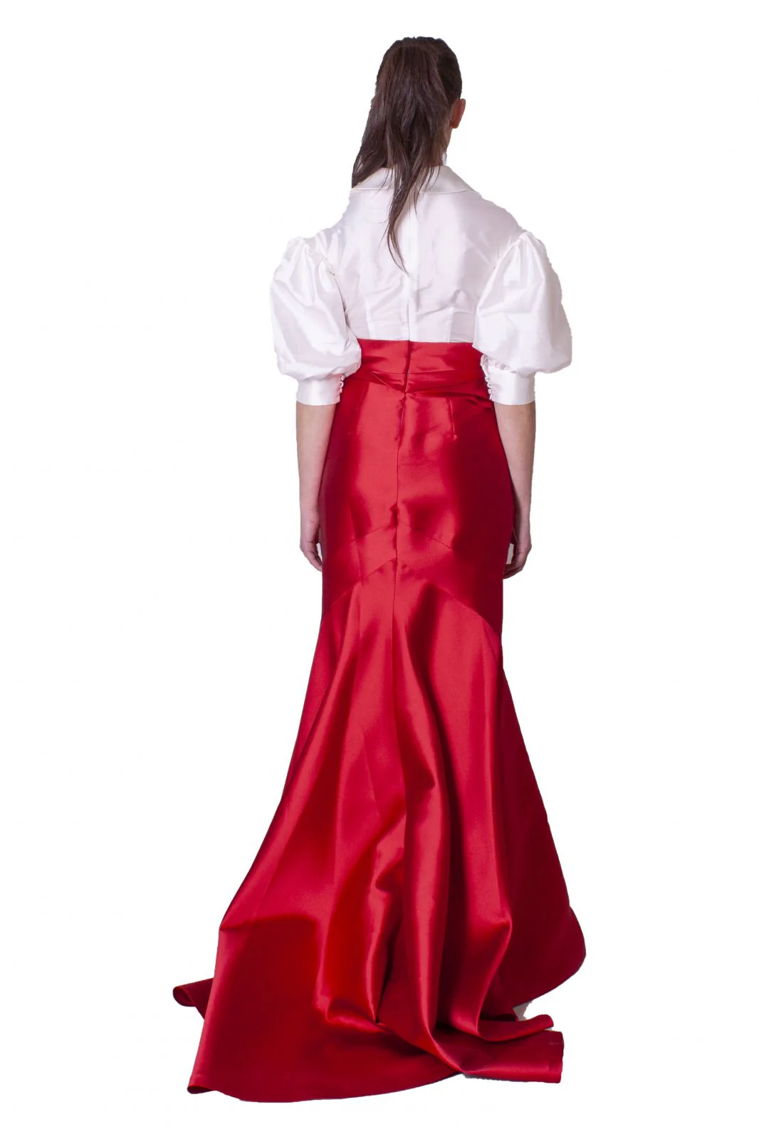 Abito lungo con gonna modello a sirena in mikado di seta rosso magenta e camicia bianca in taffetà con maniche a palloncino.Punto vita alto segnato da un peplo.Chiusura sul retro con zip a scomparsa.Foderato.90% Poliestere 10% SetaCodice:VL5303/SC