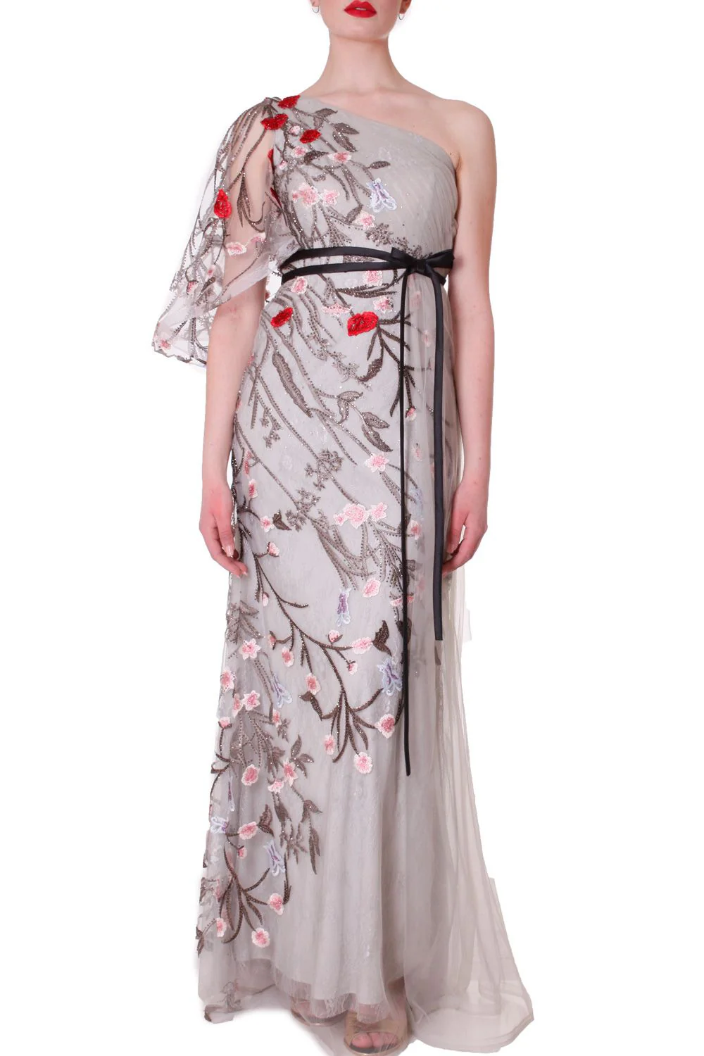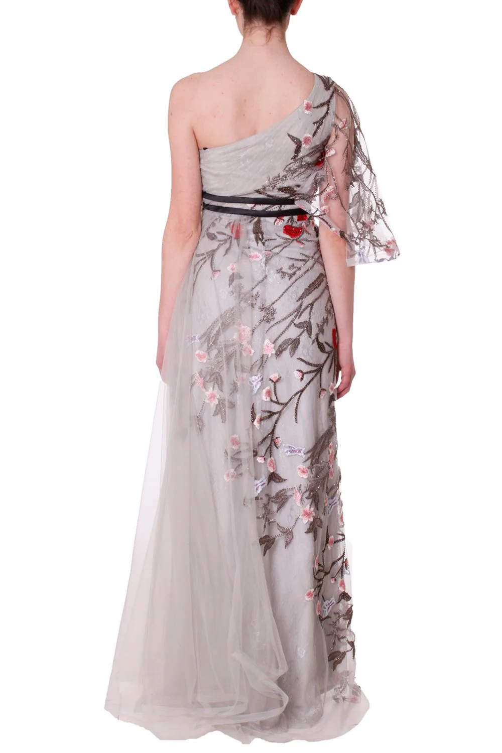 Abito lungo in tulle grigio con ricami ramage e fiori a contrasto.Modello monospalla con punto vita segnato da nastrino di grò a contrasto.Chiusura laterale con zip a scomparsa.Foderato100% PoliestereCodice:AF2301-HONOUR