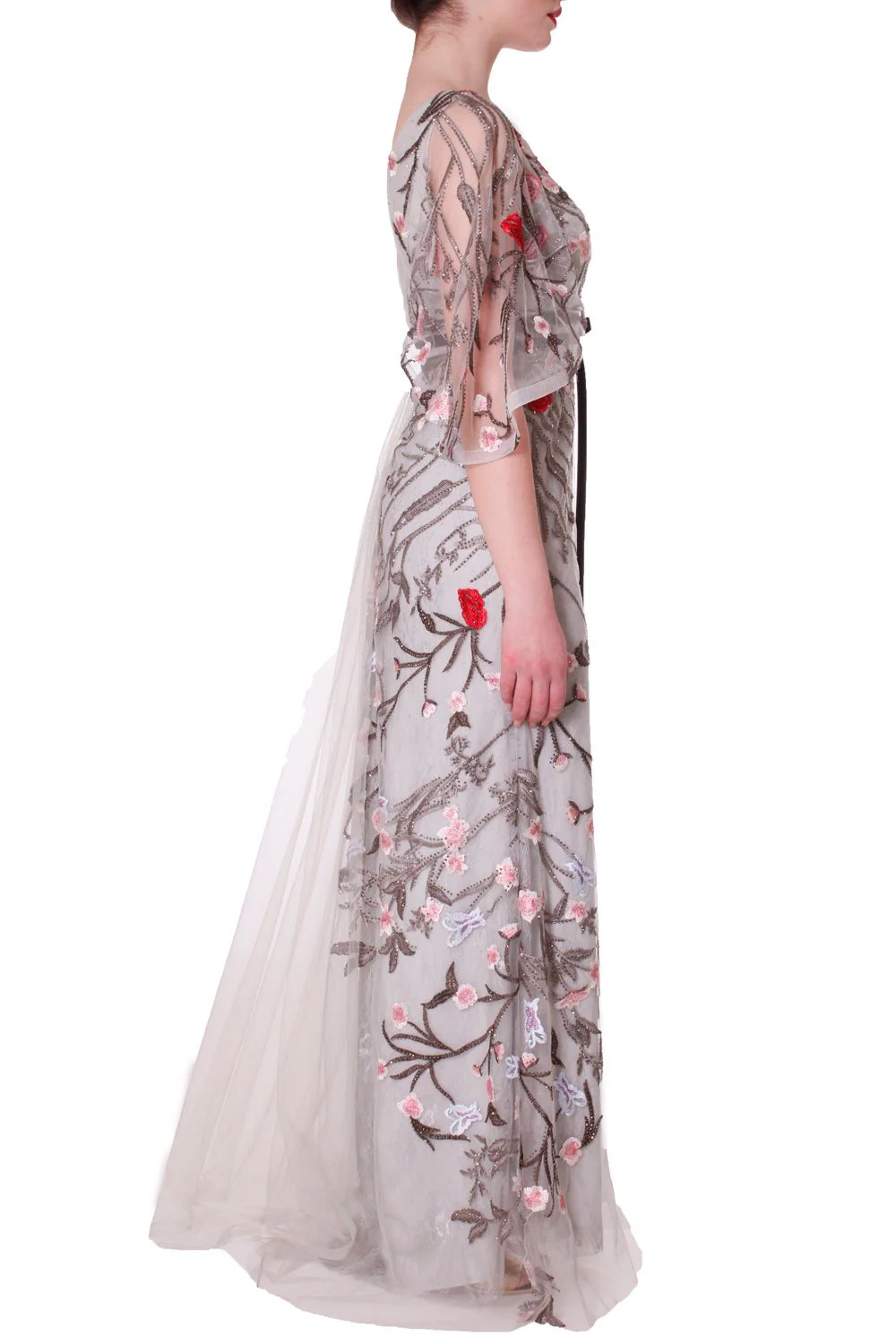 Abito lungo in tulle grigio con ricami ramage e fiori a contrasto.
