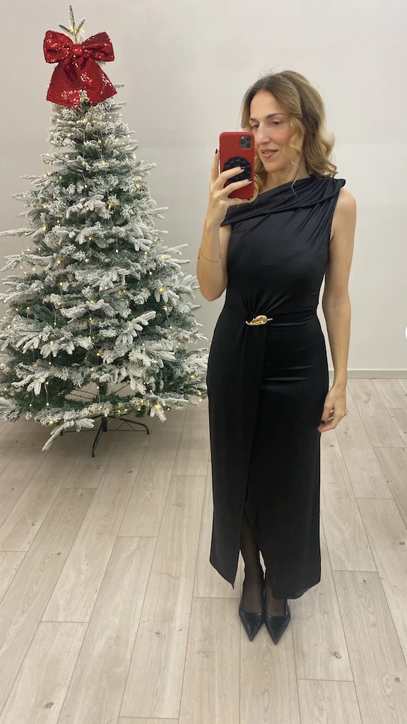 Abito lungo Vicolo scollo asimmetrico con spacco frontale. Con dettaglio fibbia metallo.