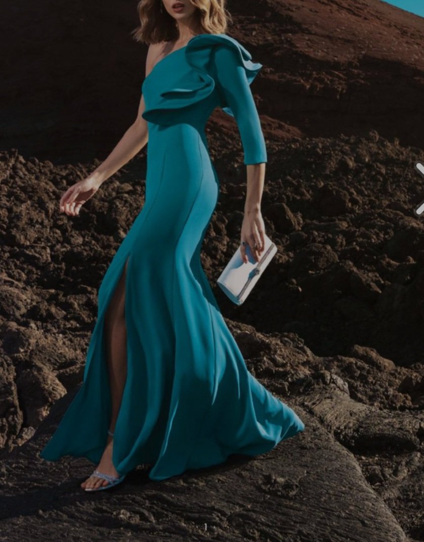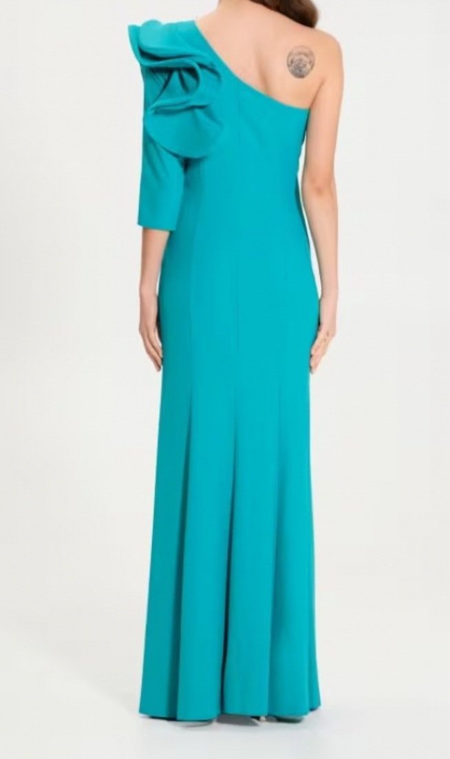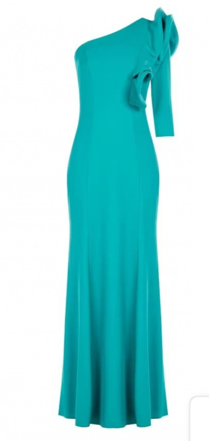 abito monospalla Rinascimento nuova collezione 2024 motivo di rousce sulla spalla spacco laterale