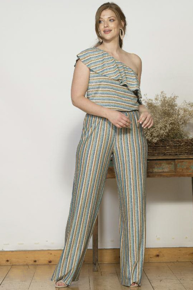 Completo top e pantalone in jersey a righe con filo di lurex che dona lucentezza. Il top monospalla con volant rende il look ideale per una cerimonia o un’occasione speciale. Il pantalone con elastico morbido in vita, scende largo senza segnare.