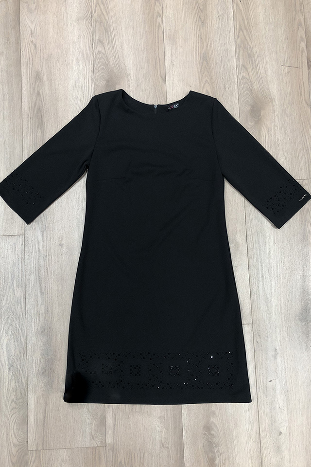 Abito tubino leggermente svasato con manica 3/4 e fondo impreziositi da motivo con strass.