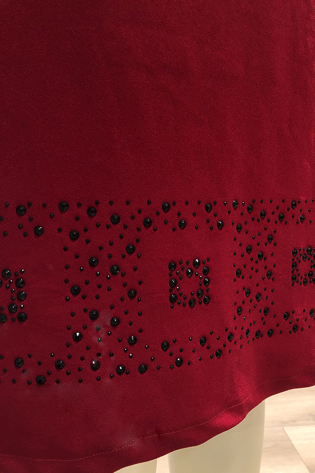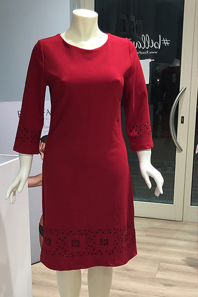 Abito tubino leggermente svasato con manica 3/4 e fondo impreziositi da motivo con strass. Disponibile nei colori: rosso e nero Composizione: 90% Poliestere, 3% Elastan