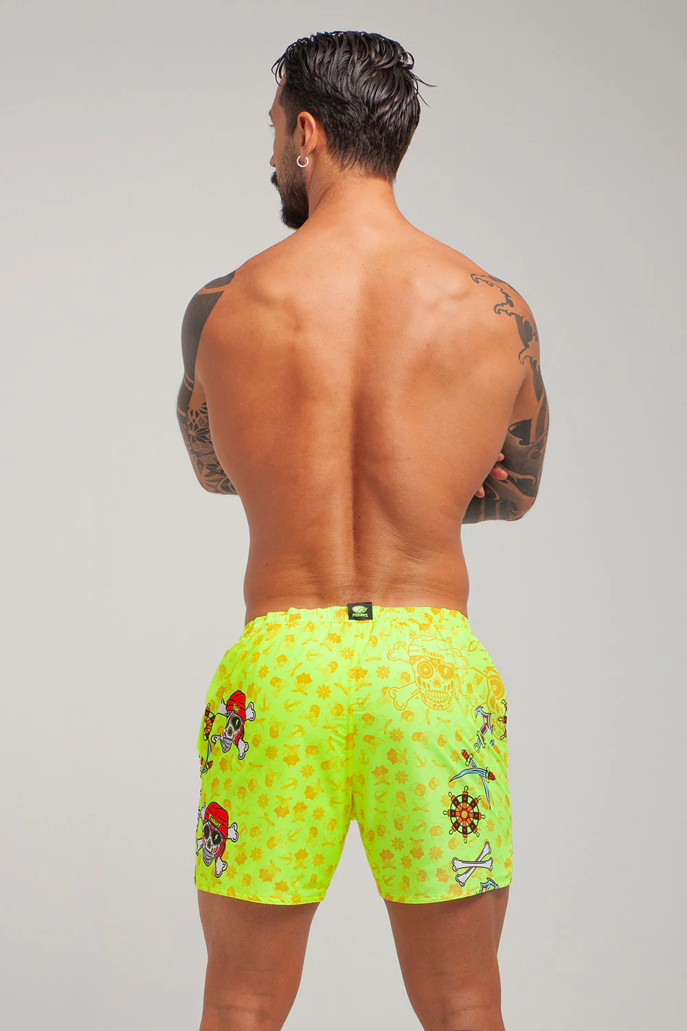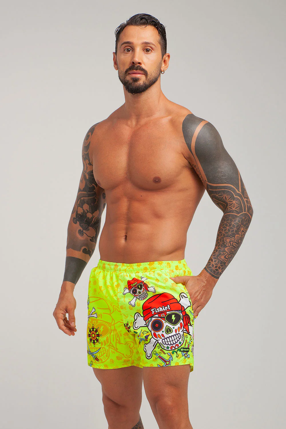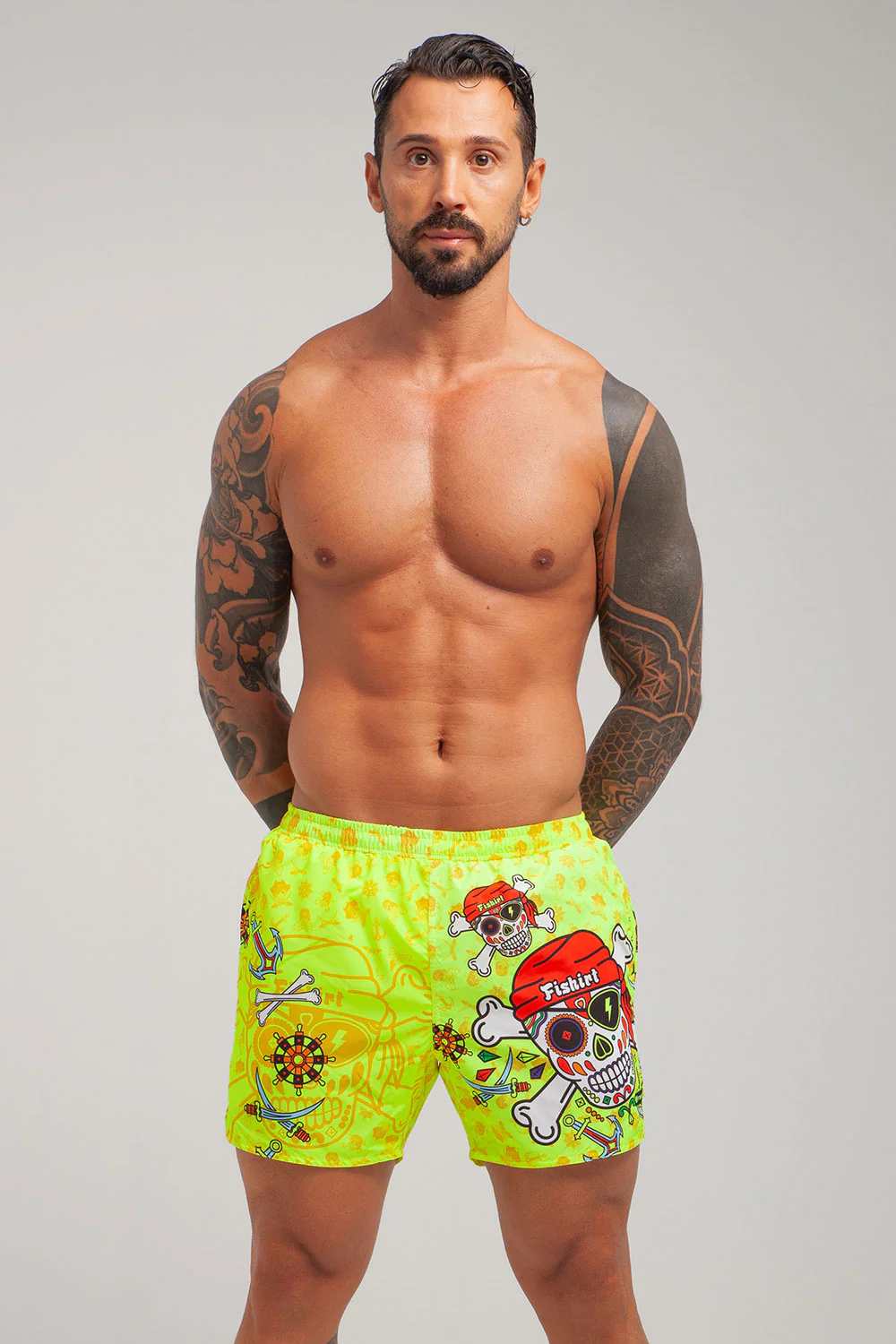COSTUME DA BAGNO IN TESSUTO TECNICO ITALIANO 2 TASCHE LATERALI LACCETTO INTERNO RETINA INTERNA GRAFICHE UNICHE DISEGNATE A MANO RAPIDA ASCIUGATURA MADE IN ITALY RESISTENTE A CLORO, SALSEDINE E ALTRI AGENTI ESTERNI COMPOSIZIONE: 100% POLIESTERE – 150 gr/m2