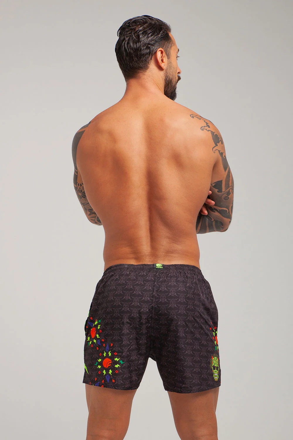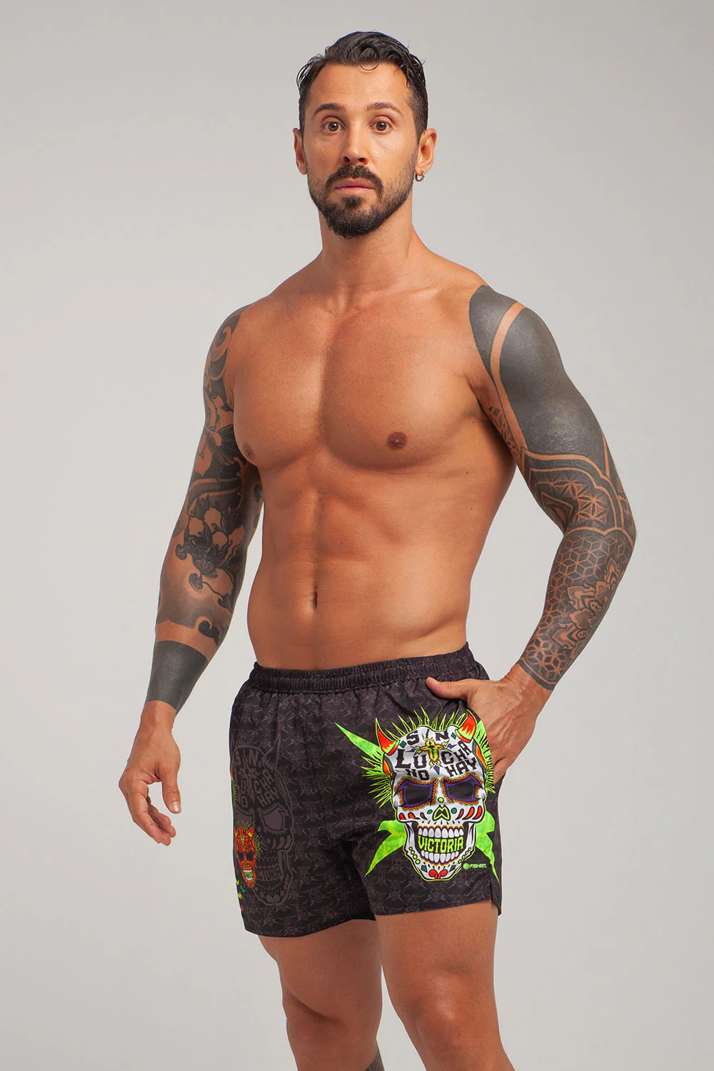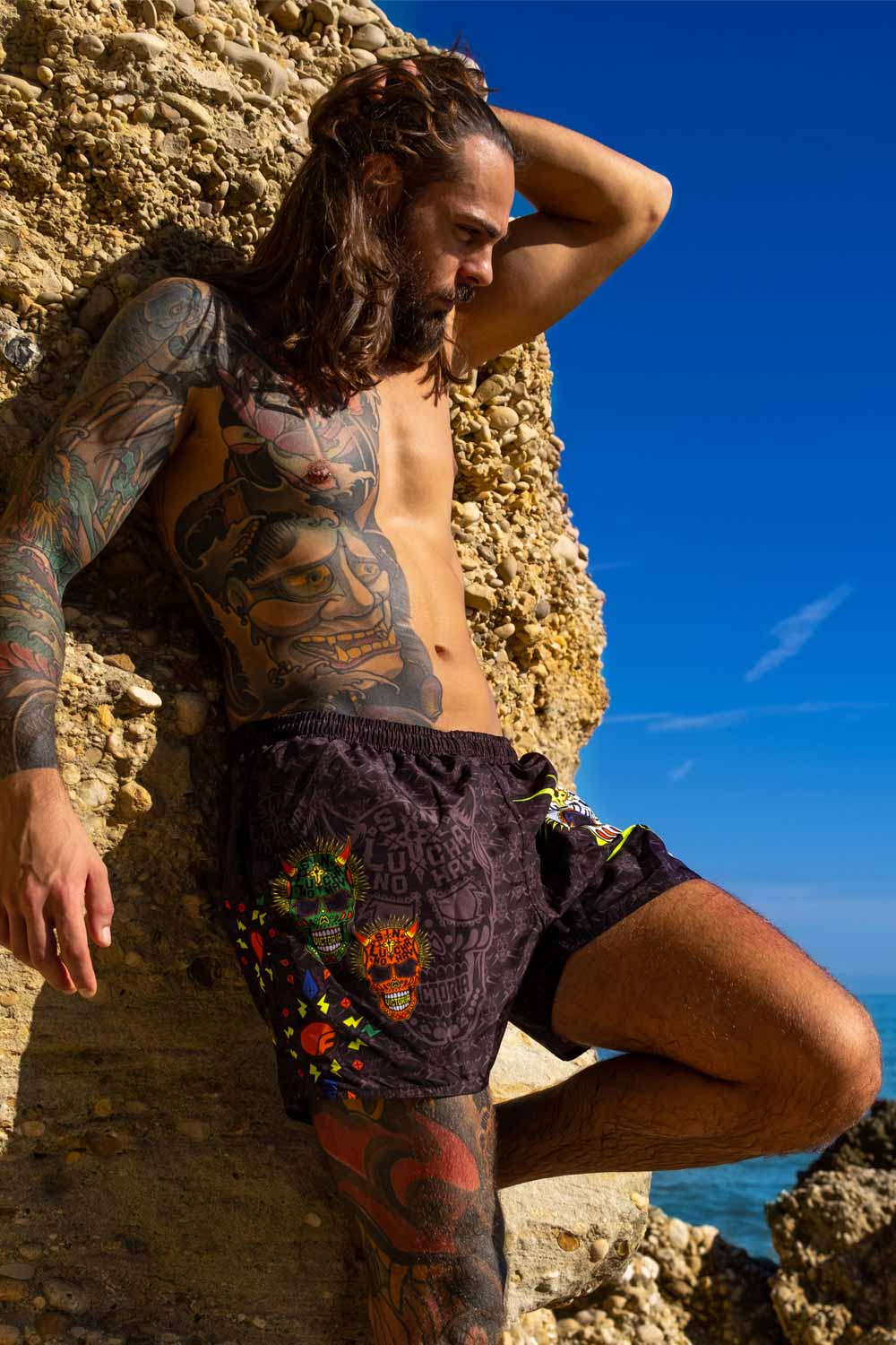 COSTUME DA BAGNO IN TESSUTO TECNICO ITALIANO 2 TASCHE LATERALI LACCETTO INTERNO RETINA INTERNA GRAFICHE UNICHE DISEGNATE A MANO RAPIDA ASCIUGATURA MADE IN ITALY RESISTENTE A CLORO, SALSEDINE E ALTRI AGENTI ESTERNI COMPOSIZIONE: 100% POLIESTERE – 150 gr/m2