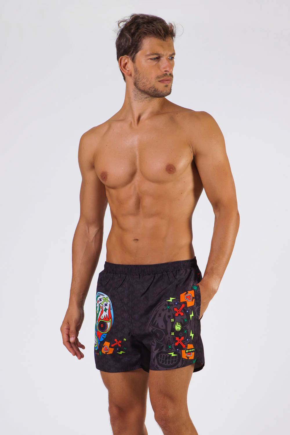 COSTUME DA BAGNO IN TESSUTO TECNICO ITALIANO 2 TASCHE LATERALI LACCETTO INTERNO RETINA INTERNA GRAFICHE UNICHE DISEGNATE A MANO RAPIDA ASCIUGATURA MADE IN ITALY RESISTENTE A CLORO, SALSEDINE E ALTRI AGENTI ESTERNI COMPOSIZIONE: 100% POLIESTERE – 150 gr/m2