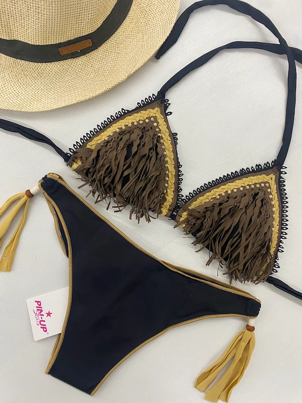 Bikini Donna Pin Up Stars Triangolo Frange e Perline Nero PG145SG