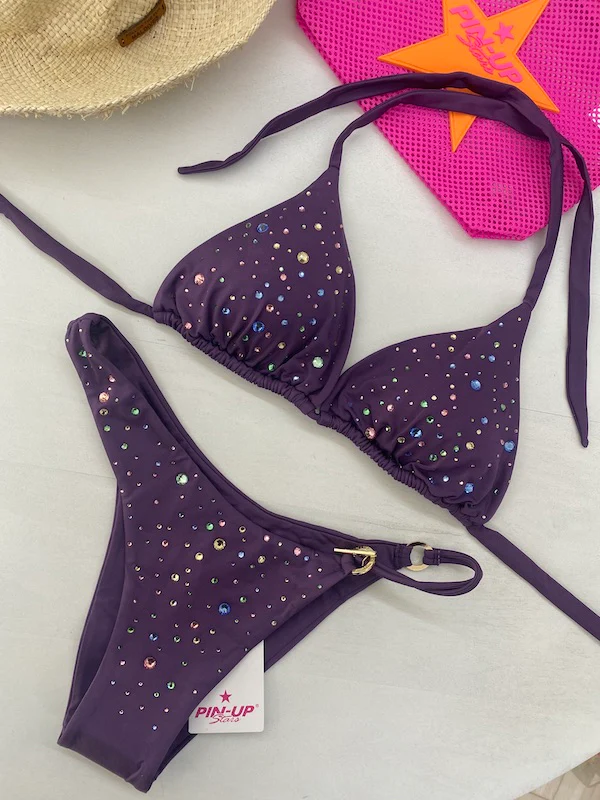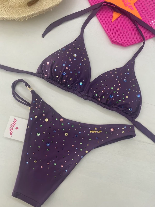 Bikini Donna Pin Up Stars Triangolo Pioggia di Strass Slip Small Viola