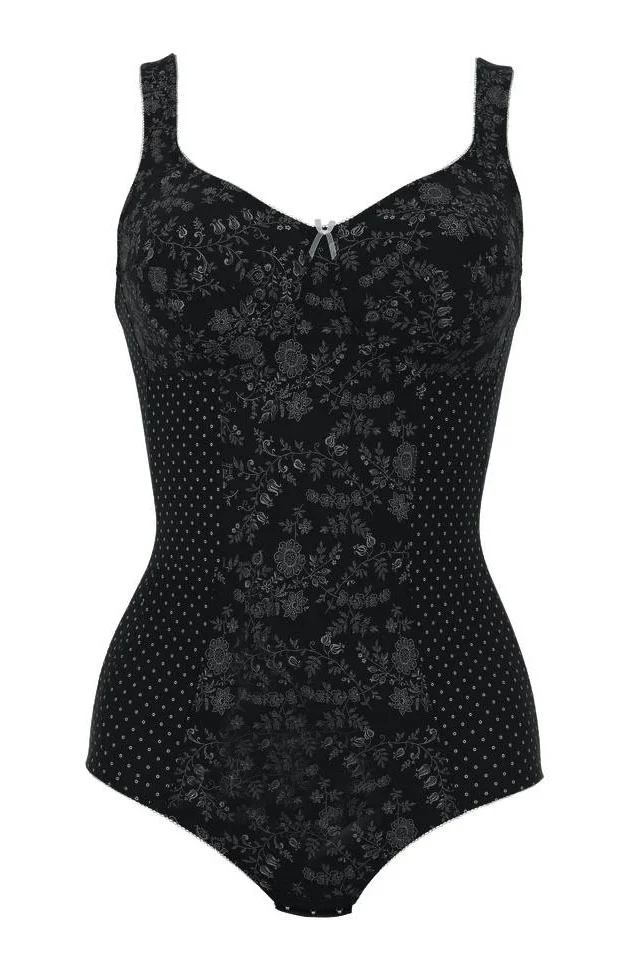 Body intimo senza ferretto, colore nero, coppe tagliate in tre parti per assicurare una elevata funzione di sostegno, sottocoppa foderato, spalline leggermente imbottite sulle spalle. Funzione di contenimento alta.