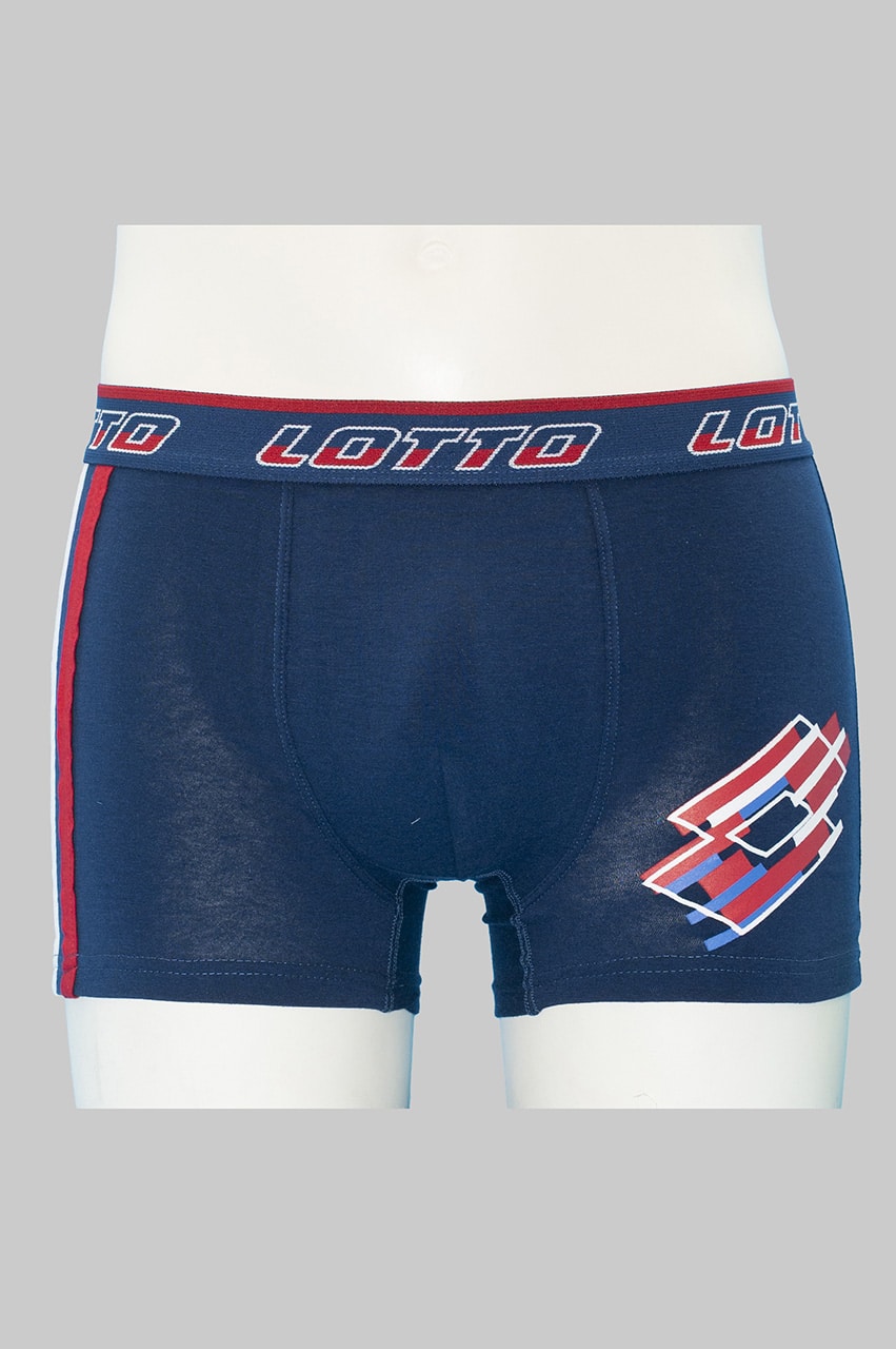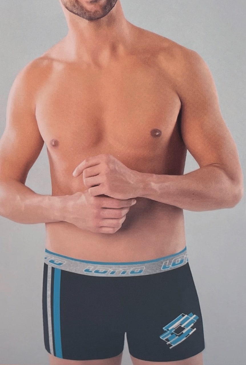 Boxer uomo cotone elasticizzato Lotto LB1286. Comfort sportivo e stile moderno in cotone elasticizzato, con elastico a vista stampato. Disponibili in nero, blu e grigio, taglie dalla 3 alla 7.
