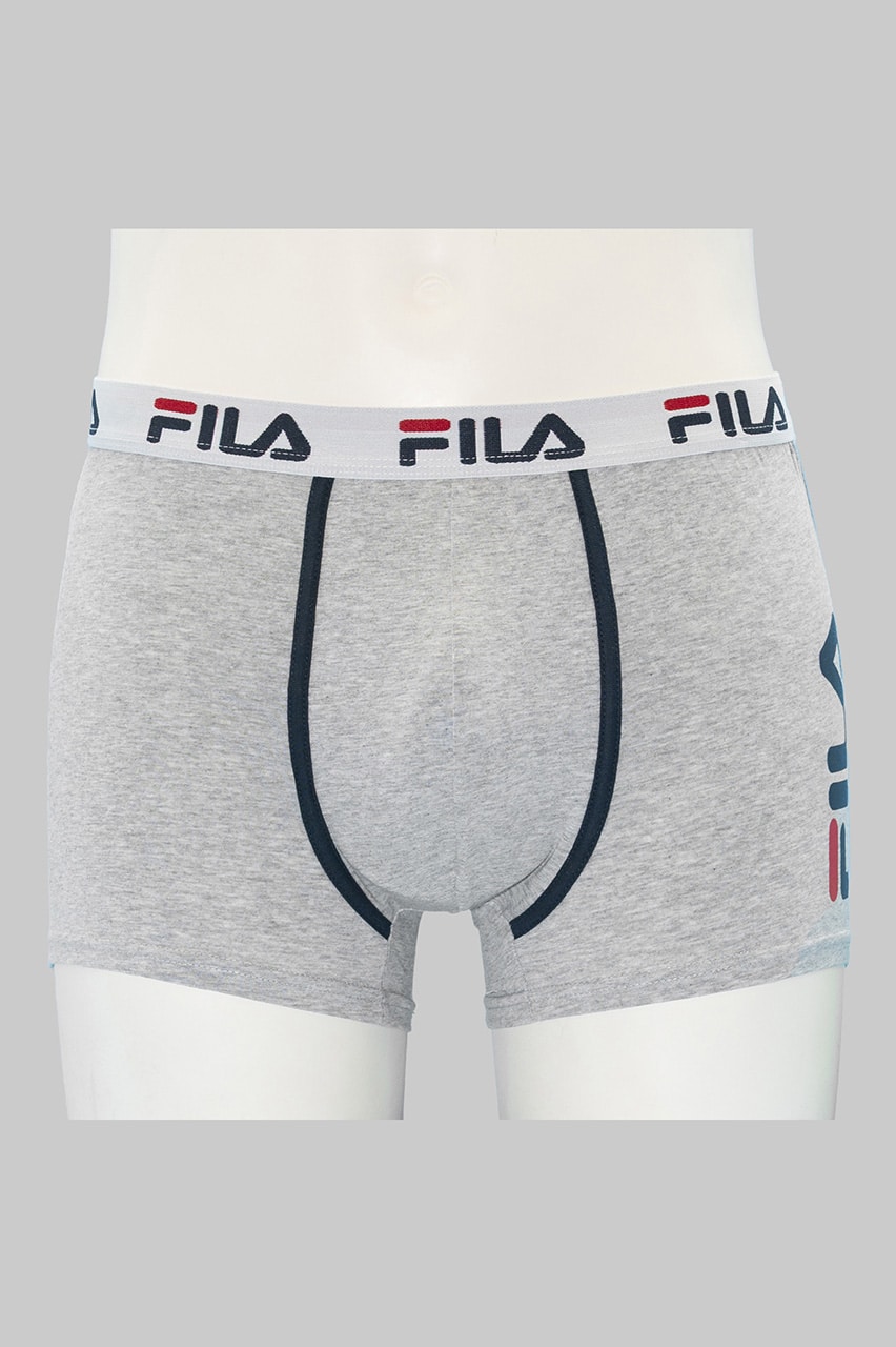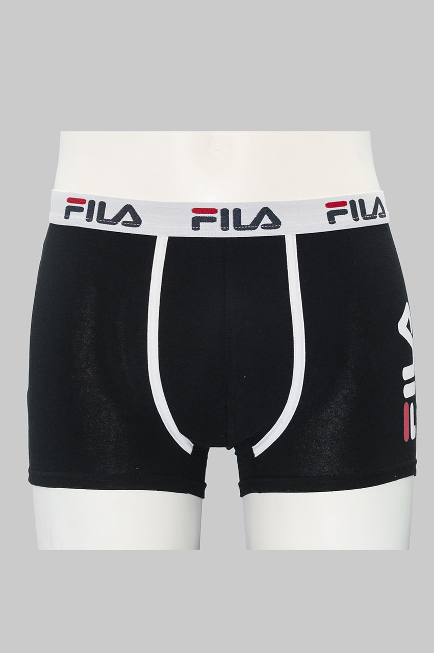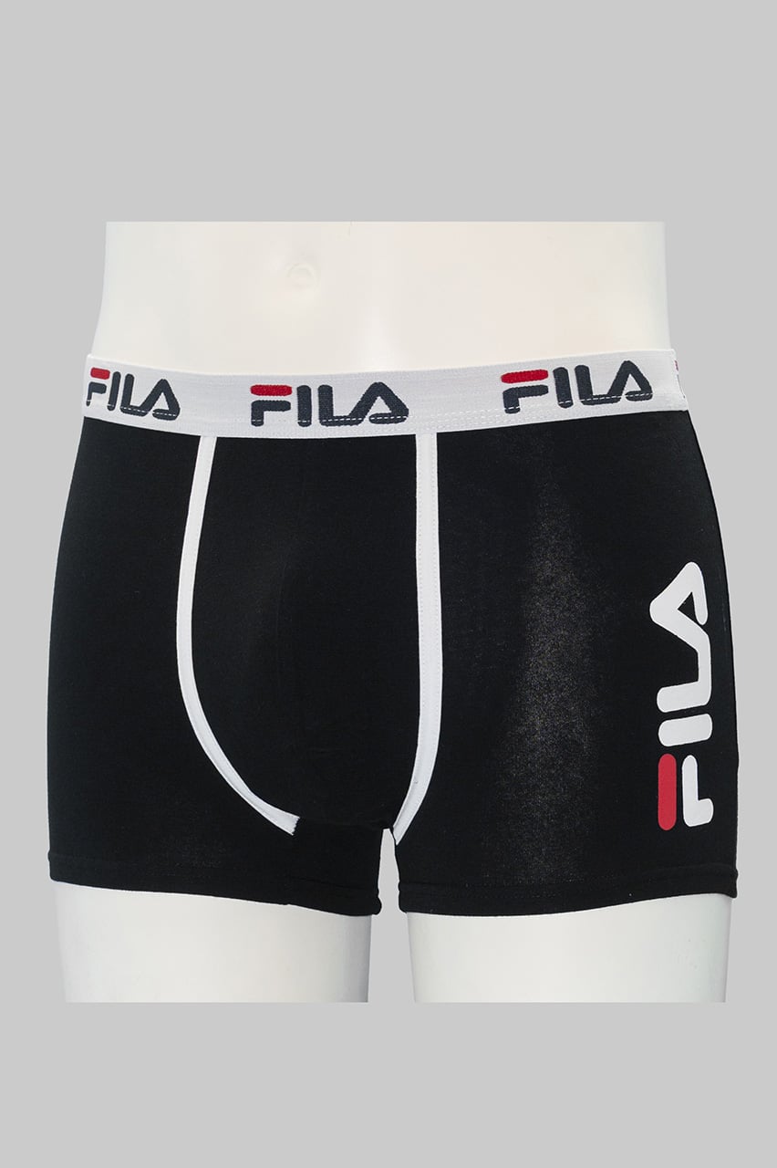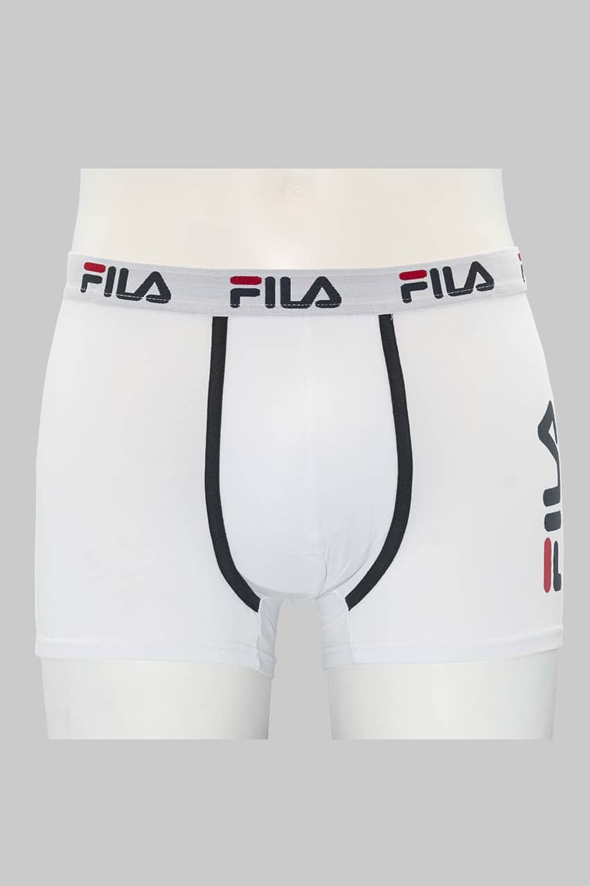I boxer uomo Fila in cotone elasticizzato FU5040 combinano comfort e stile con tinta unita e stampa Fila laterale grande, disponibili in nero, bianco e grigio.