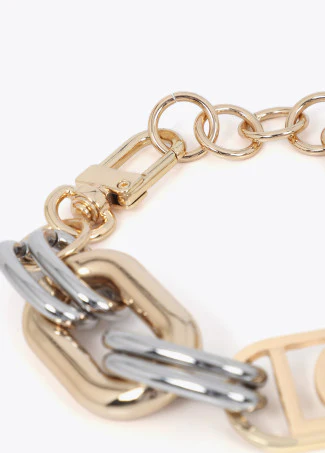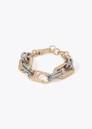 Bracciale bicolore oro/argento con maglie e finitura metallica e logo ovale centrale.