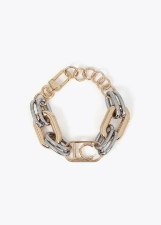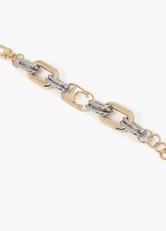 Bracciale bicolore oro/argento con maglie e finitura metallica e logo ovale centrale. Design elegante con chiusura a moschettone. Diametro: 22cmComposizione: 15% Lega di zinco 40% Acrilico 45% Ferro Codice: LF2503015-METAL