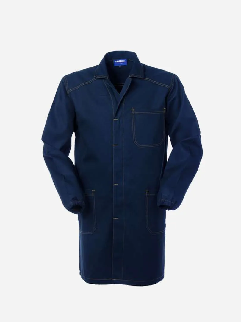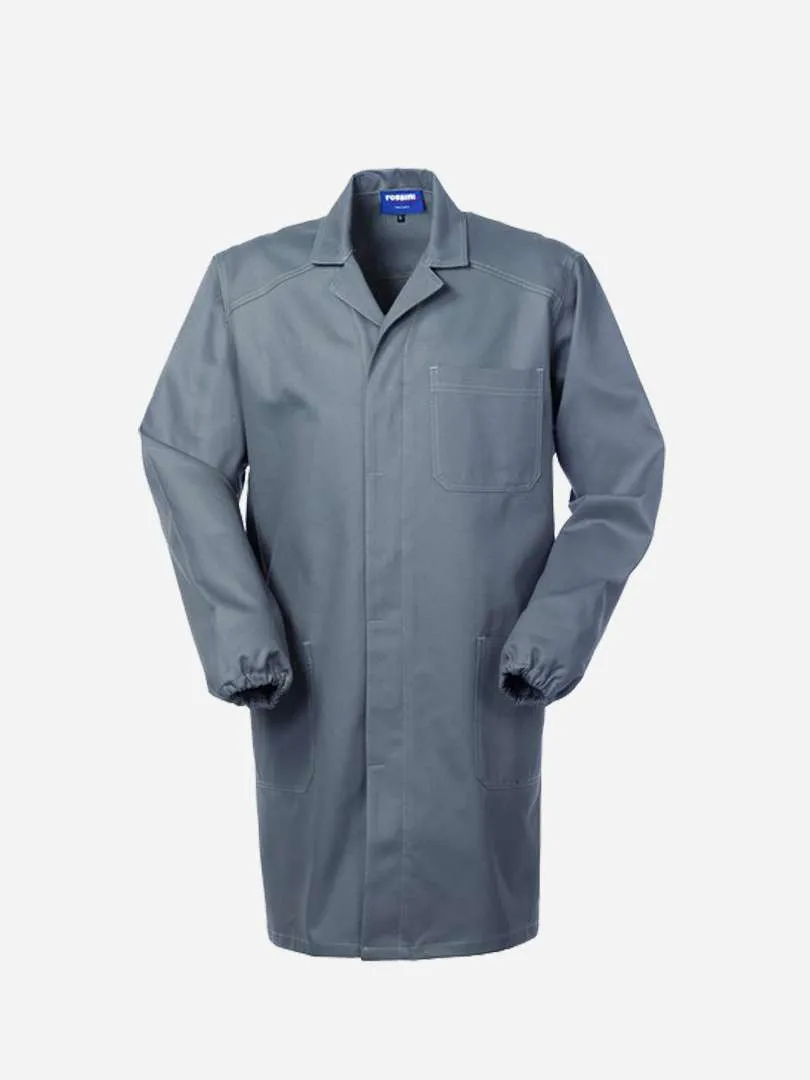 Camice da lavoro con chiusura anteriore con bottoni coperti. Taschino al petto e due tasche inferiori, polsi con elastico, cuciture di colore a contrasto. Tessuto 100% cotone irrestringibile dal peso di 280 gr/mq.