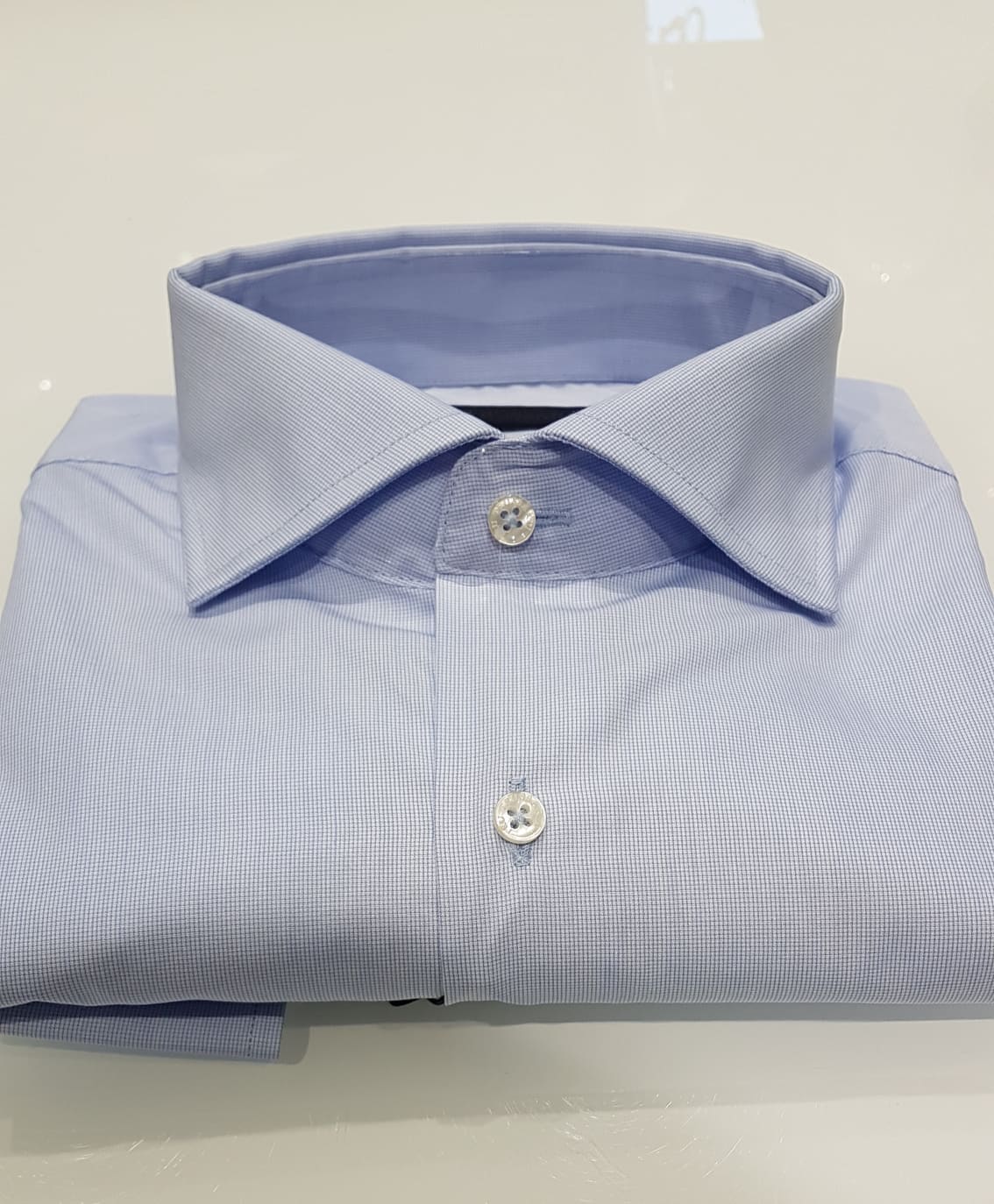 Camicia uomo Trussardi. Slim fit, quadretti piccoli azzurri. 100% Cotone.