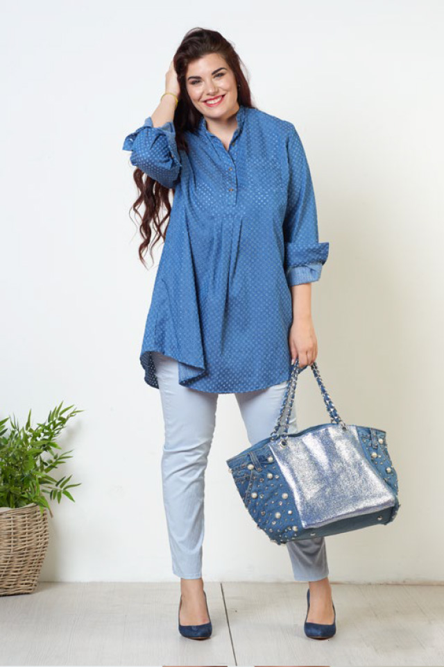 Camicia ampia traforata a laser, abbottonatura fino al seno, manica lunga.