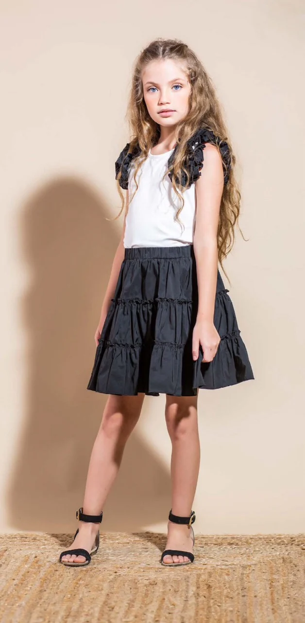 Gonna corta bambina Vicolo Girl con balza ed elastico in vita. Tessuto 42% cotone e 58% poliestere con fodera sotto. Taglie 4 anni, 6 anni, 8 anni, 10 anni, 12 anni, 14 anni. Vestibilità abbondante. Colori Nero .