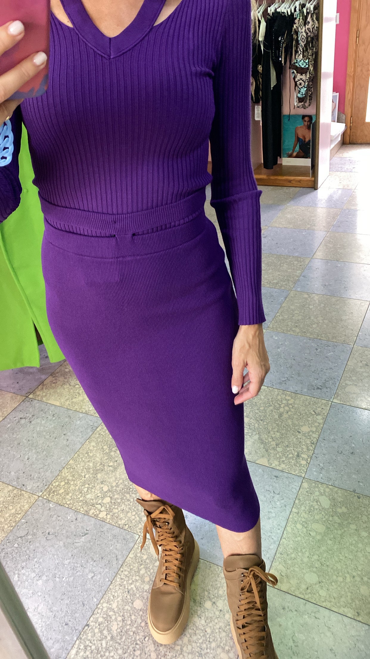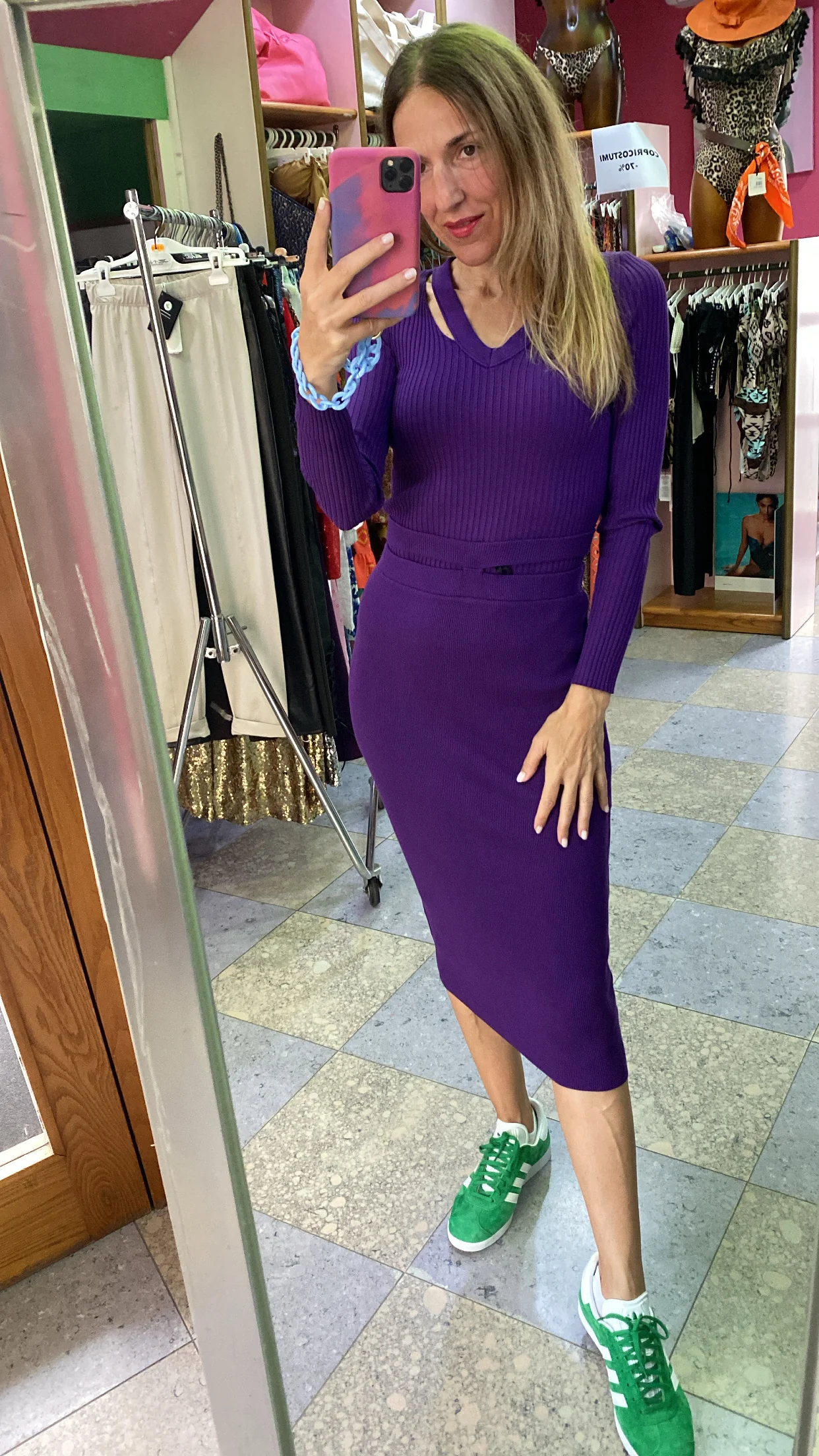 Gonna Lunga Vicolo in maglia. Dettaglio cut out in vita. Composizione 70% viscosa e 30% poliestere. Colore Viola Taglia Unica ( XS / M ).