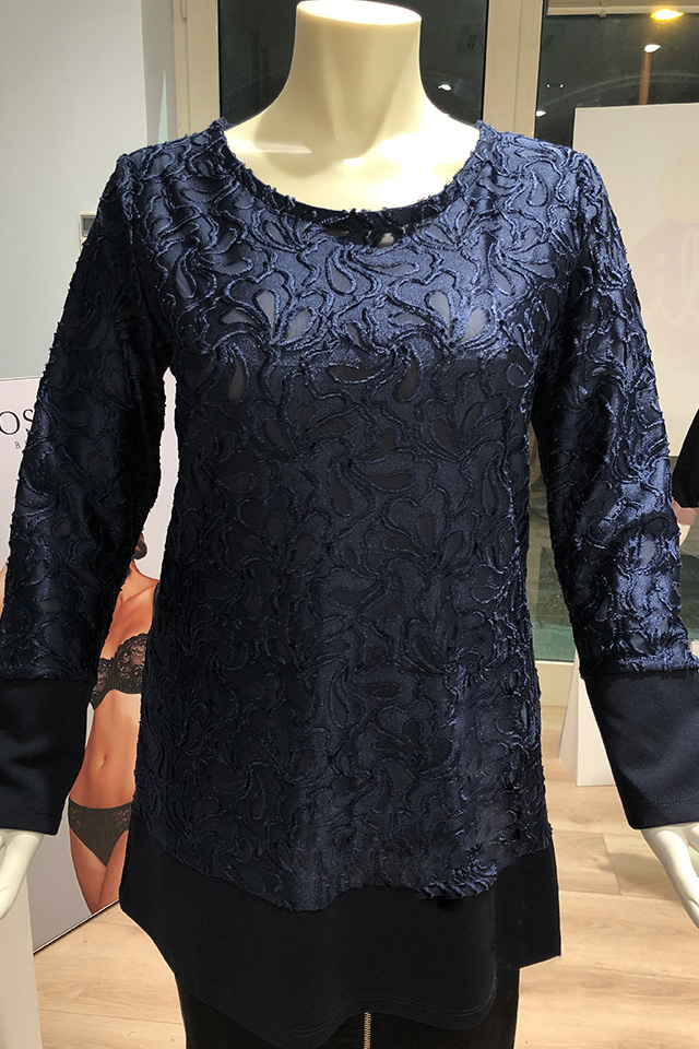 Maglia elasticizzata in simil pizzo con fantasia degradè bronzo su fondo bianco latte o nero, con meraviglioso contrasto. Perfetto l’abbinamento ai nostri pantaloni e gonne