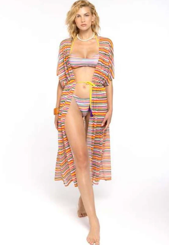 Fuori acqua 4giveness, collezione SS24 del Mood Stripes Latino. Kimono lungo in tulle elastico a fantasia righe , manica corta cintura in vita.
