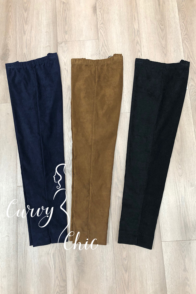 Pantalone in morbido tessuto scamosciato, disponibile nei colori: Blu, Nero e Bruciato.