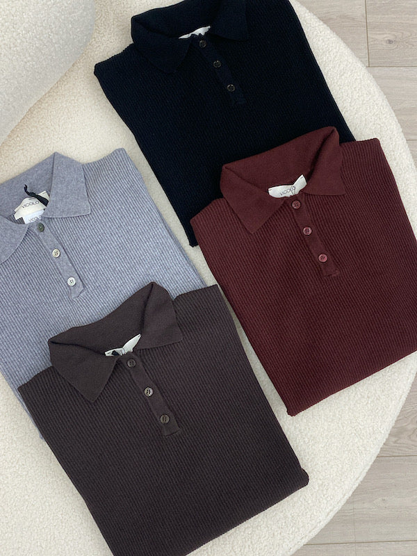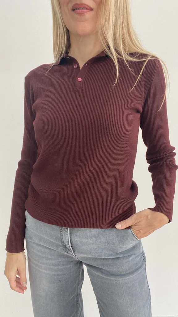Polo maniche lunghe a costine con colletto e bottoni. Composizione: 82% viscosa, 30% poliestere e 8% angora. Colori Moro, Bordeaux, Grigio e Nero. Taglia Unica