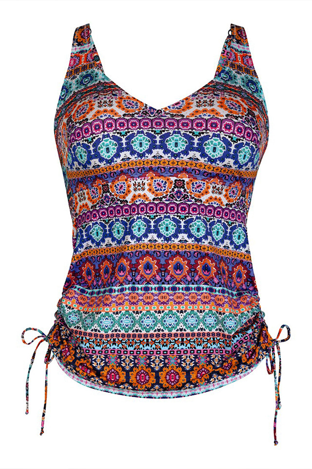 Affascinante e femminile il top tankini con ferretto trasmette emozioni con il suo look etnico! Con i suoi lucenti colori, Malaika non arricchisce soltanto la spiaggia, ma puรฒ essere anche arricciato e regolato in lunghezza grazie ai laccetti laterali. Da abbinare si possono scegliere gli slipย in tinta unita blu Malin Bottom e Bonny Bottom e per completare il look l’abito Brava