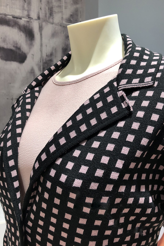 Giacca in maglia in misto lana stampa optical, lunghezza alla coscia. Da indossare come soprabito o con i pantaloni per un look chic.