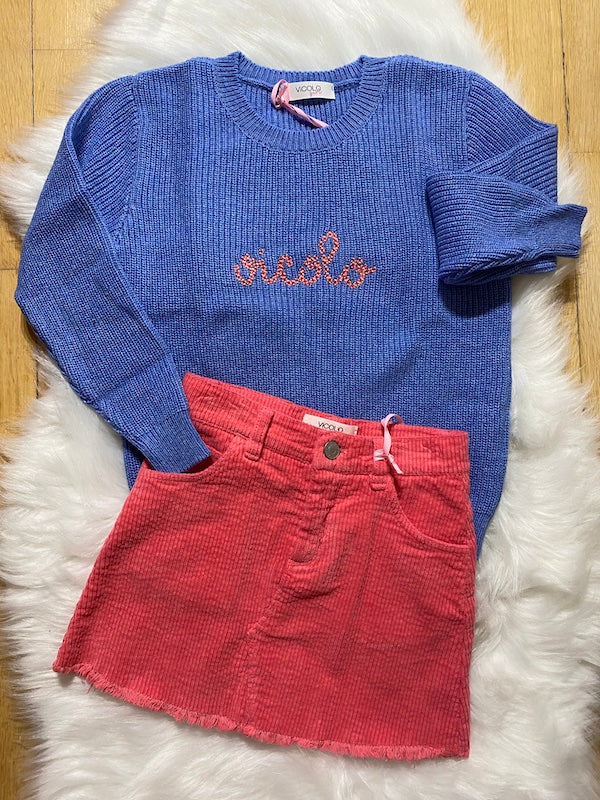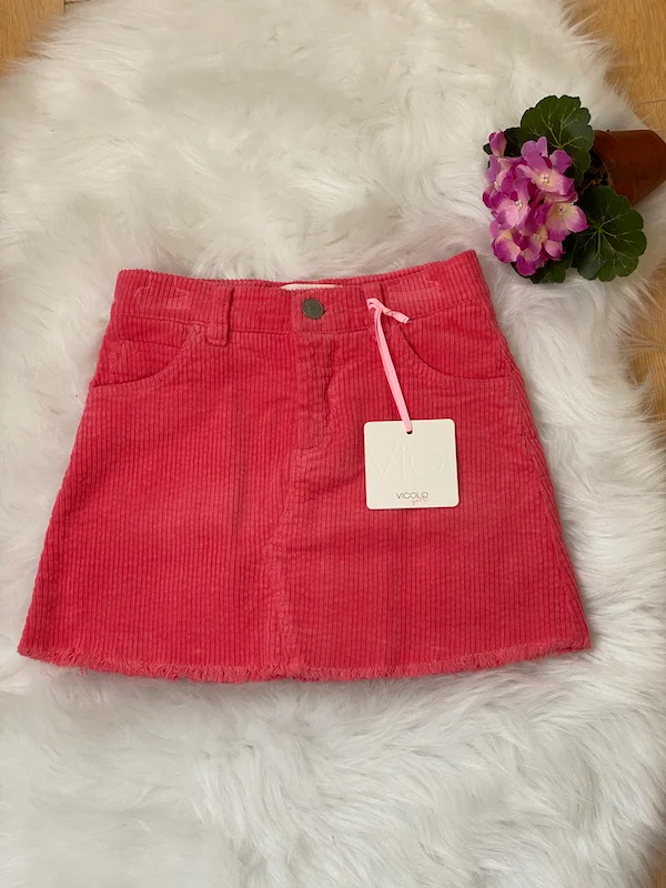 Mini Gonna da Bambina Vicolo Girl in velluto rigato , tasche frontale e tasche dietro, chiusura con bottone, sfrangiata giu sull’orlo. Composizione 97% cotone e 3% elastan. Taglie disponibili 6 ANNI ( ALTEZZA CM 116 – BUSTO 58 -FIANCHI 53 – BACINO 60 ), 8 ANNI ( ALTEZZA CM 128 – BUSTO 61 – FIANCHI 56 – BACINO 65 ), 10 ANNI ( ALTEZZA CM 140 – BUSTO 65,5 – FIANCHI 59 – BACINO 70 ), 12 ANNI ( ALTEZZA CM 152 – BUSTO 72 – FIANCHI 63 – BACINO 79 ).