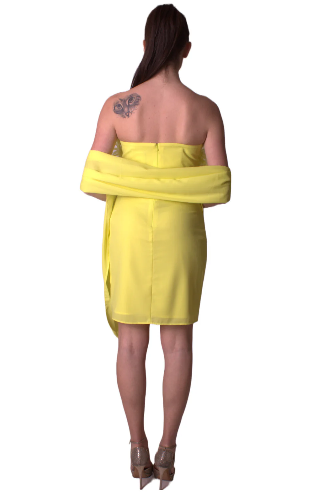 Abito in cady giallo lime modello tubino con scollatura totale.Corpino strutturato con applicazioni di piume in tono.Chiusura sul retro con zip a scomparsa.Stola in abbinamento inclusa.Foderato.100% PoliestereCodice:91/LIME