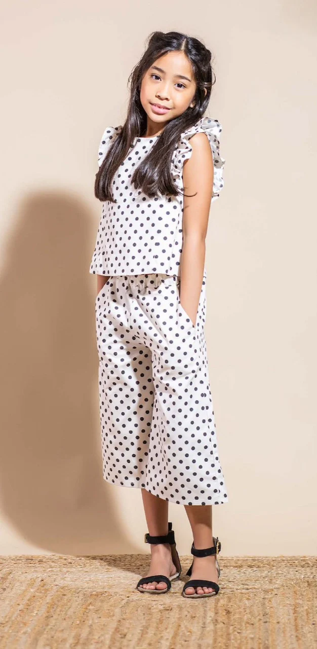 Pantaloni Bambina Vicolo in cotone fantasia pois con elastico in vita e tasche laterali. Composizione 100% mussola di cotone. Taglia disponibili 4 anni.