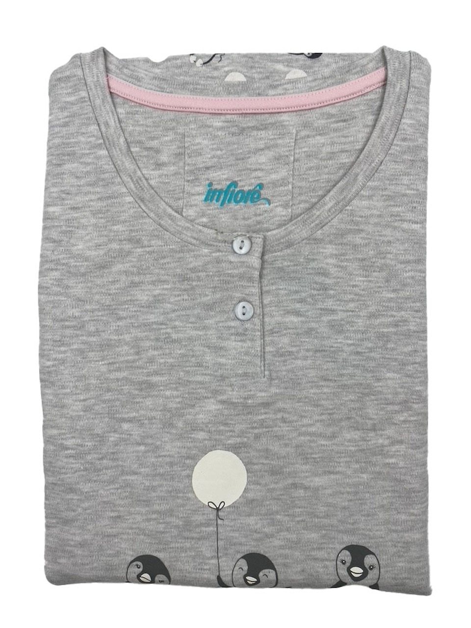 Pigiama caldo cotone donna Infiore 1430: la scelta ideale per affrontare le fredde serate invernali con comodità e allegria. Realizzato in caldo cotone, questo pigiama offre calore e morbidezza, perfetto per garantire notti rilassanti e serene. La casacca a tinta unita con una grande stampa di pinguini dona un tocco giocoso, mentre i pantaloni con stampe piccole che riprendono il tema della casacca aggiungono un dettaglio coordinato e carino.