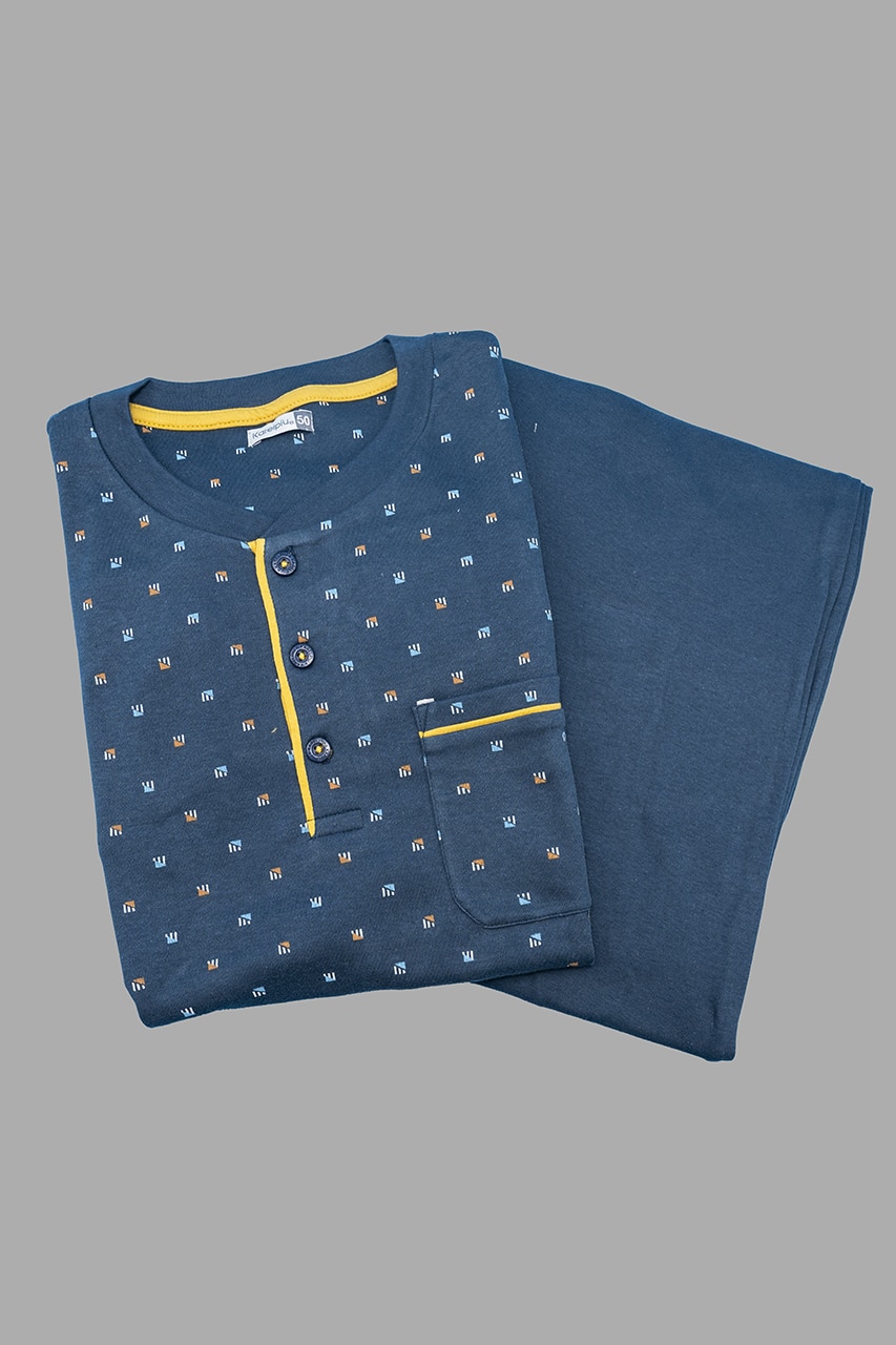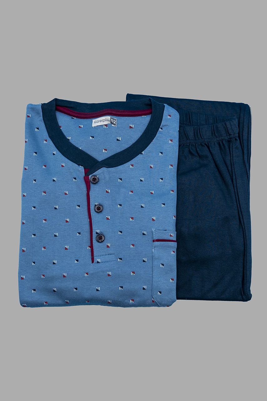 Pigiama caldo cotone uomo Karelpiù KF7104, in 100% cotone con maglia stampata, collo a bottoni, taschino e polsini. Comodo e caldo, perfetto per l’inverno e il relax in casa.
