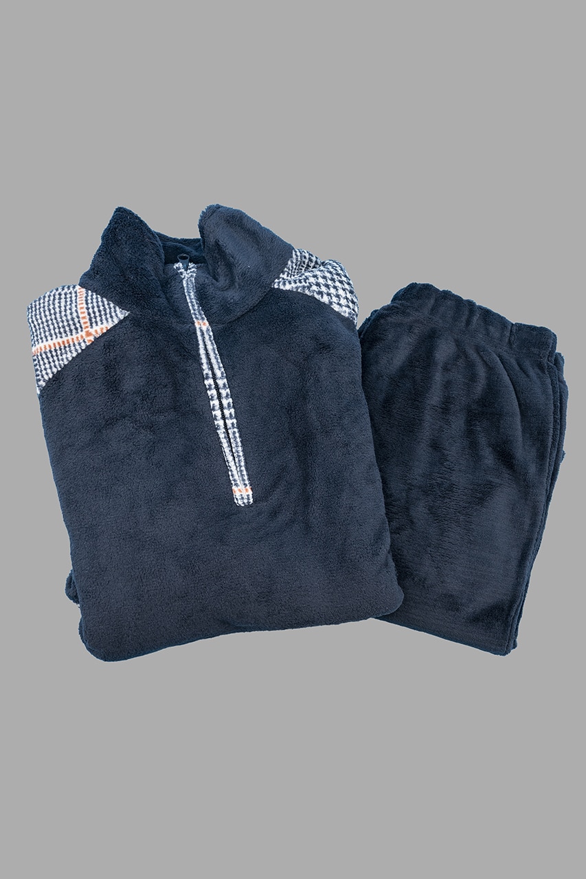 Pigiama in pile uomo Karelpiù KF7301, in coral fleece, con zip al collo e riporti fantasia. Caldo, morbido e perfetto per affrontare l’inverno con praticità e stile.