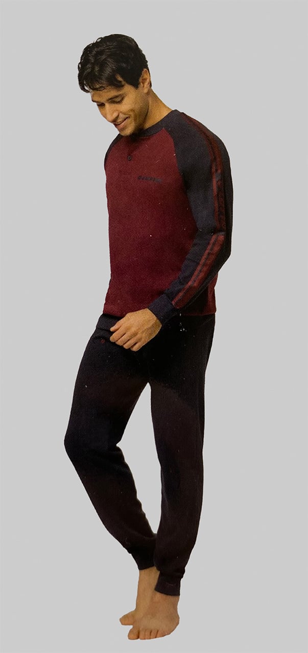 Questo elegante pigiama uomo invernale lotto presenta una maglia tinta unita abbinata a pantaloni in colore a contrasto, creando un design dinamico e contemporaneo perfetto per chi ama un look casual ma curato.