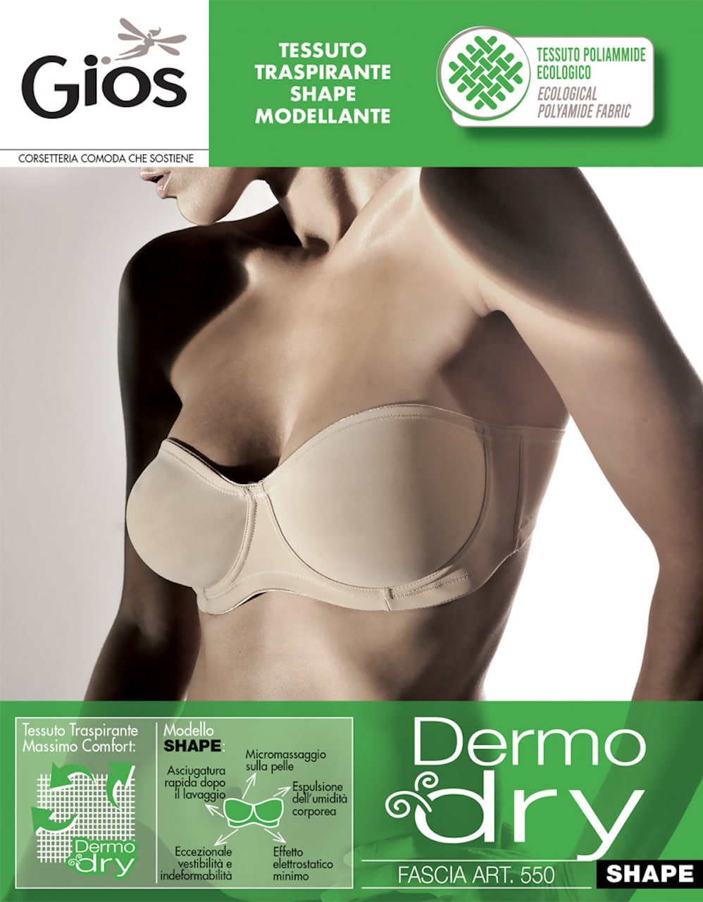 Reggiseno Gios 550 a fascia Dermo Dry con coppe preformate e ferretto. Traspirante, coppa C. Colori bianco, nero e pelle. Taglie 3-6.
