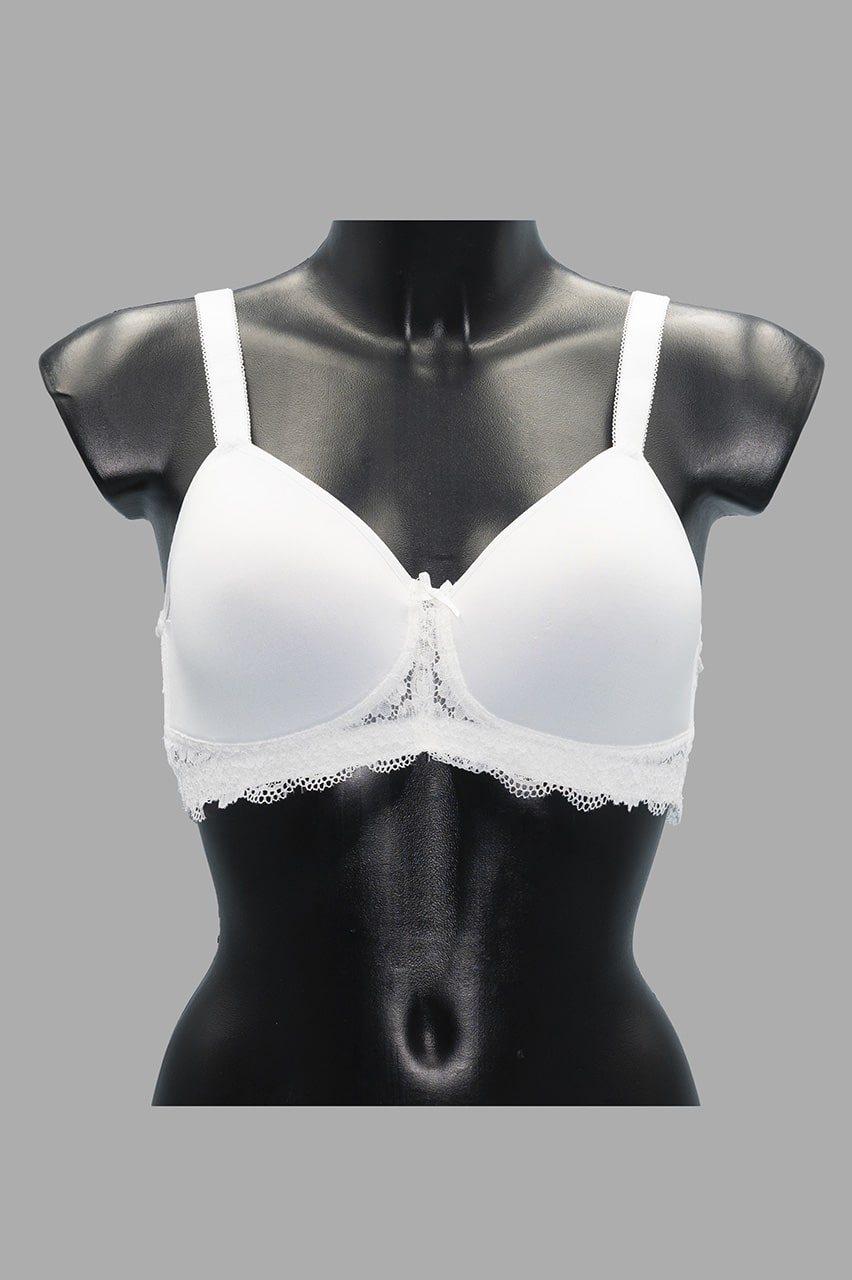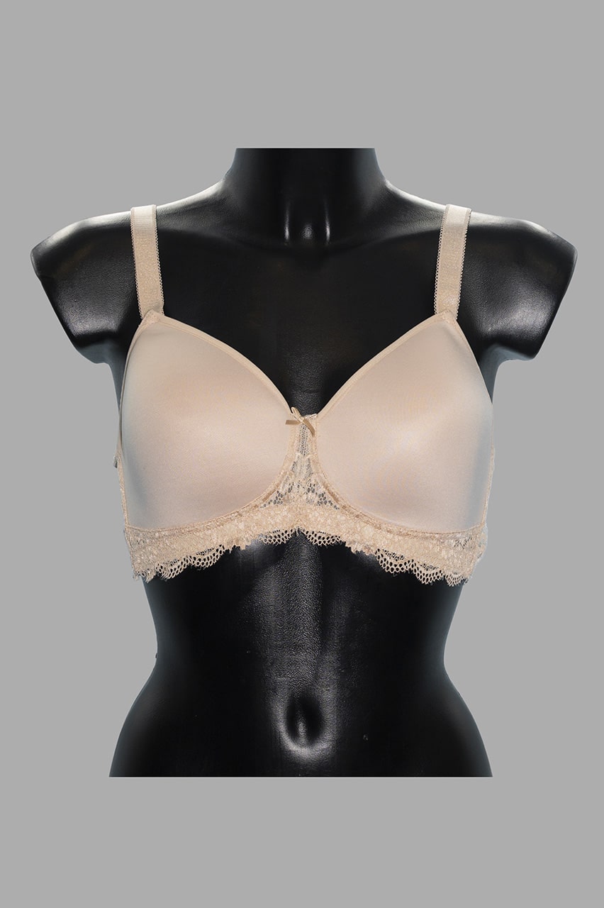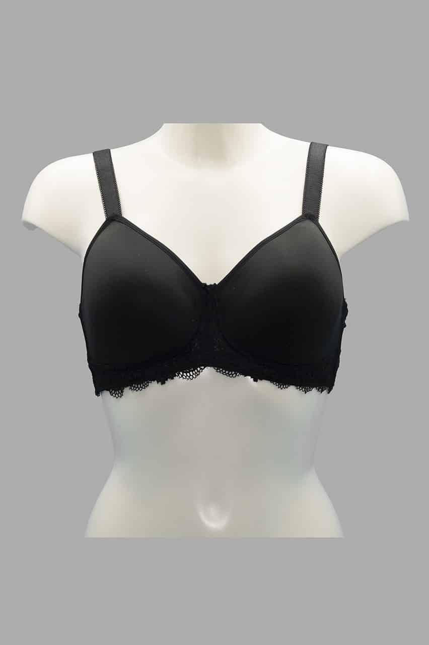 Reggiseno Sièlei senza ferretto con coppa Spacer traspirante e dettagli in pizzo. Colori bianco, nero e cipria. Taglie 5-6.