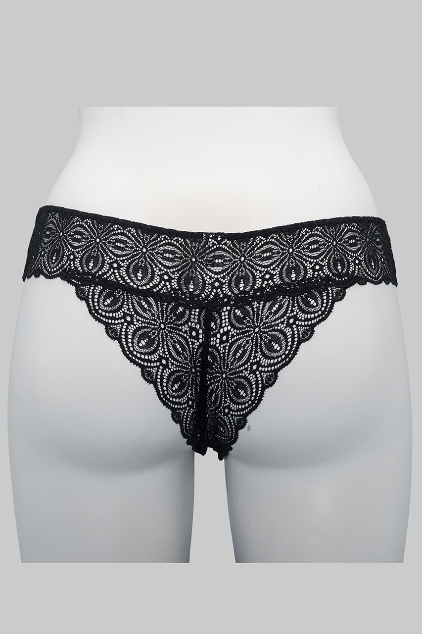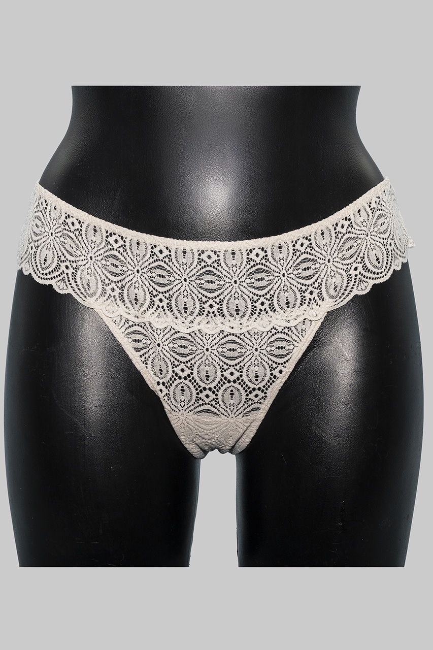 Slip brasiliana in pizzo Infiore 911: elegante e sostenibile, realizzata in pizzo riciclato, disponibile in nero, avorio e sabbia, con taglie dalla 2 alla 4.
