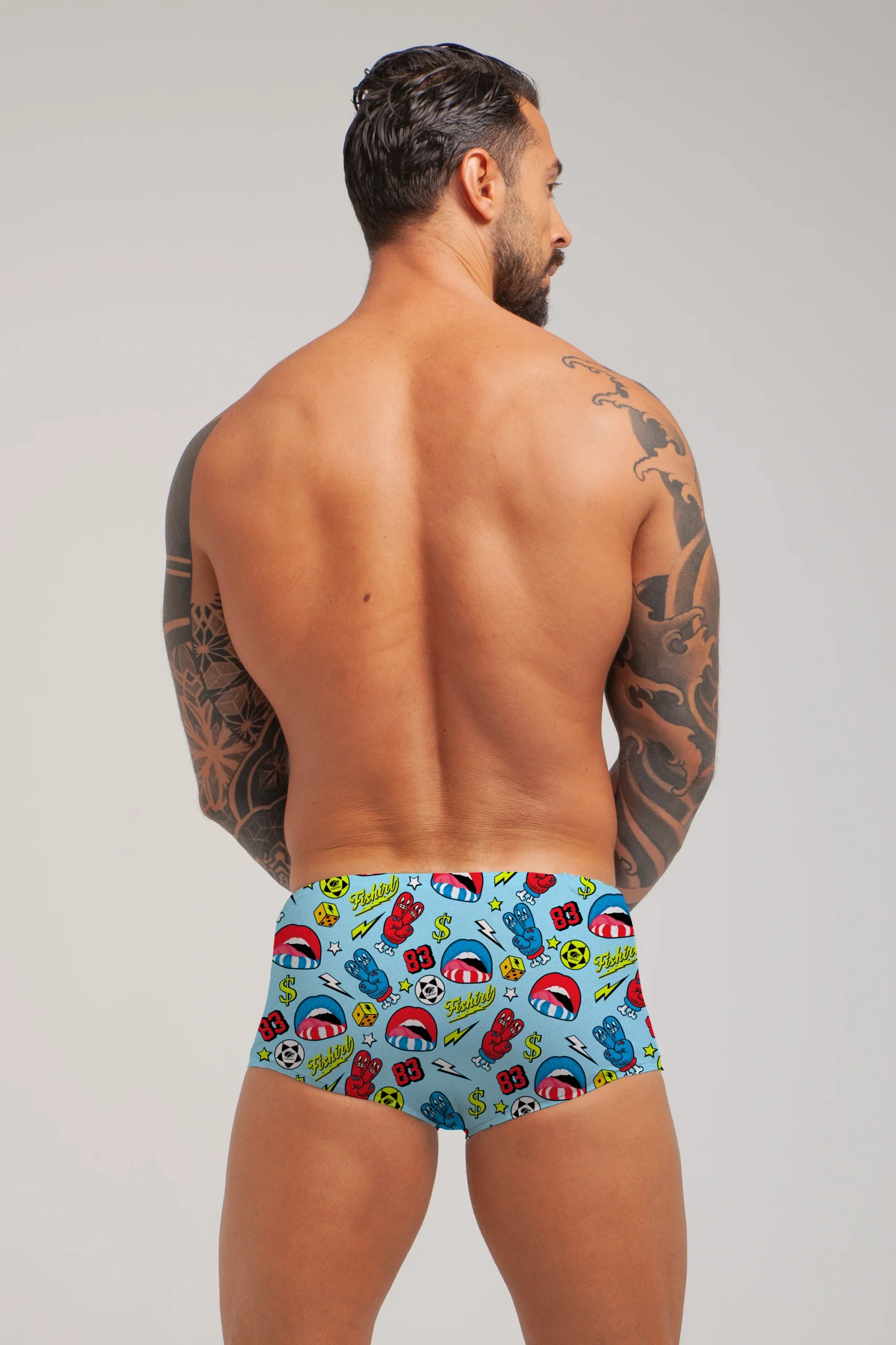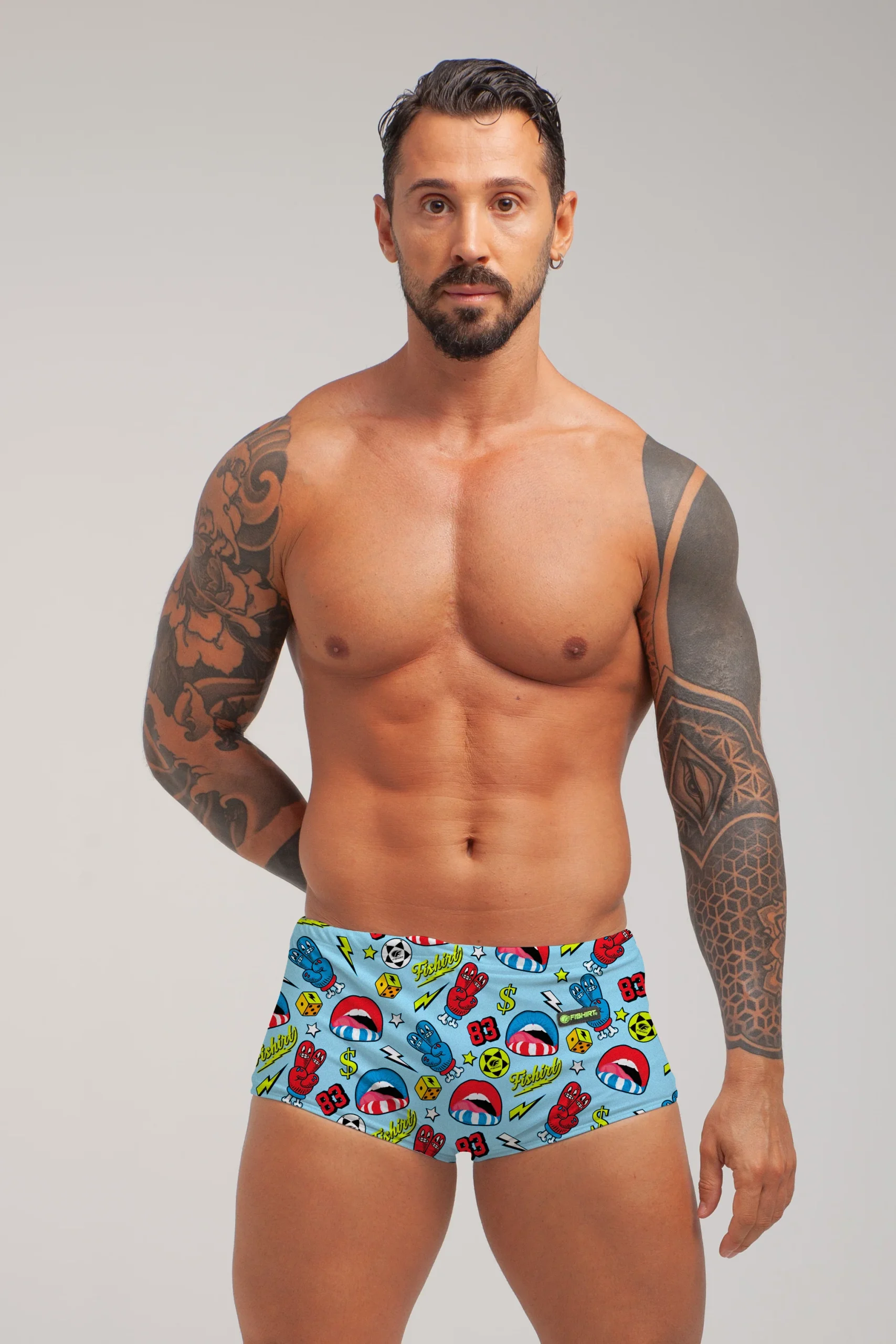 COSTUME DA BAGNO IN TESSUTO TECNICO ITALIANO GRAFICHE UNICHE DISEGNATE A MANO LACCETTO INTERNO PROTEZIONE DAI RAGGI UV ULTRA-STRETCH FIBRA RINFORZATA IN PBT RAPIDA ASCIUGATURA MADE IN ITALY RESISTENTE A CLORO, SALSEDINE E ALTRI AGENTI ESTERNI COMPOSIZIONE: 47% PBT 53% POLIESTERE – 150 gr/mq2