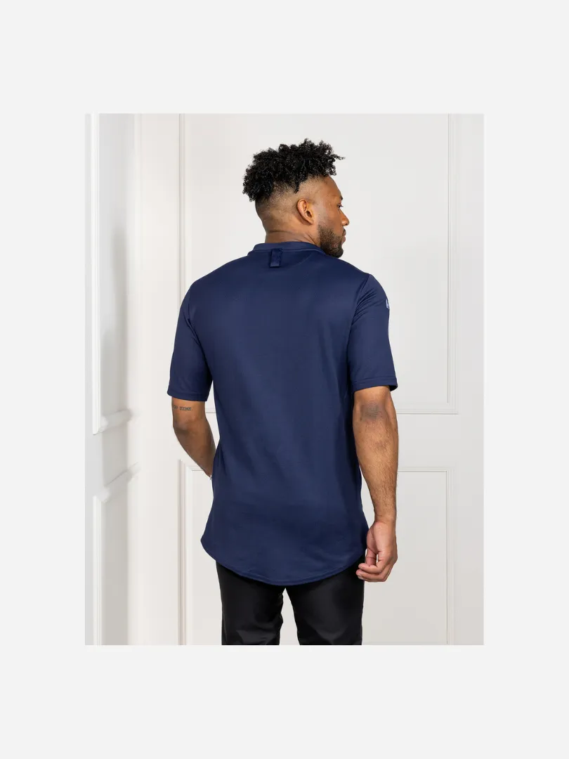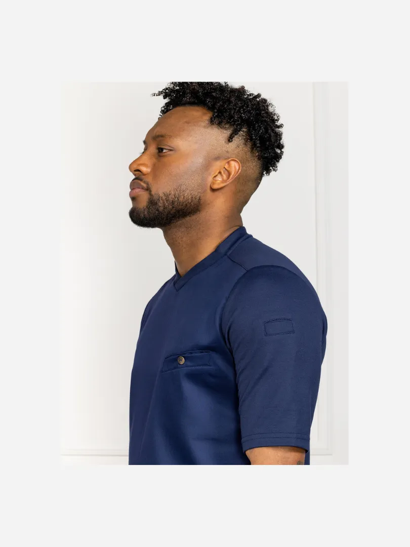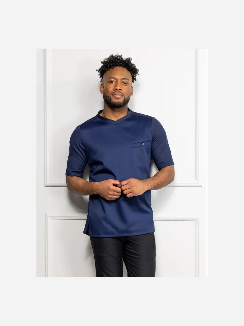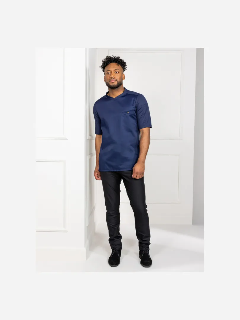 Giacca Chef manica corta modello t-shirt scollo a V Fibbia con bottone clip porta grembiule Tessuto ecosostenibile in bio-cotone e poliestere riciclato Composizione 45% poliestere riciclato 55% bio-cotone Tessuto elasticizzato sul retro – 50% poliestere 50% cotone Vestibilità slim fit Guida alla cura del capo: Tessuto resistente ai lavaggi industriali – asciugatrice programma delicato Lavare in lavatrice massimo a 60° C Tessuto candeggiabile