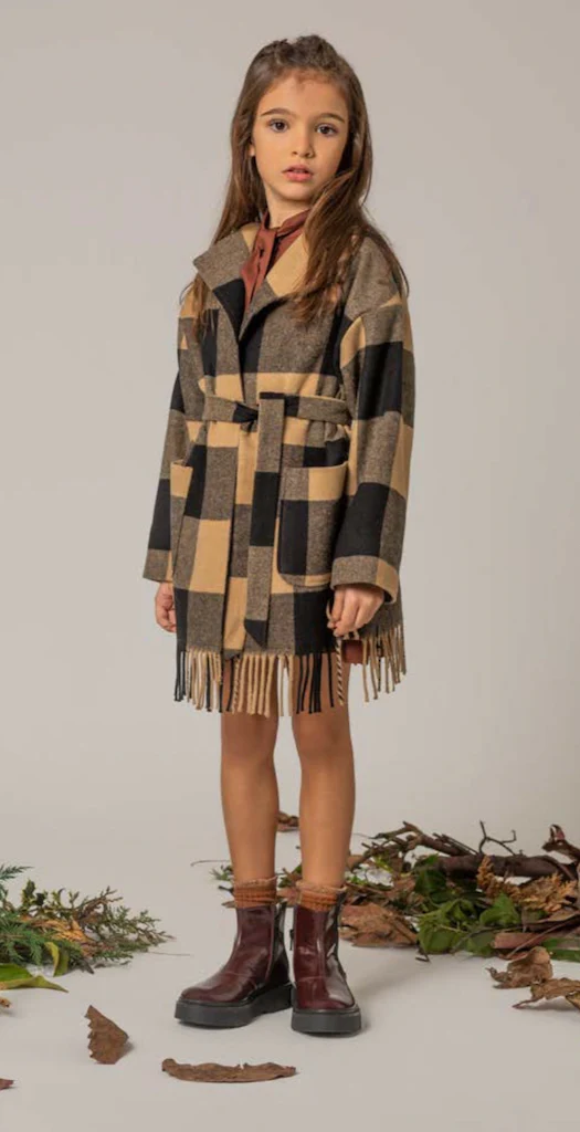 Trench da bambina Vicolo Girl, fantasia a quadri con frange sulla parte finale, cintura in vita e tasche laterali. Foderato all’interno. Composizione esterna 45% acrilico, 30% poliestere, 20% lana e 5% altre fibre, fodera 100% viscosa. Taglie disponibili 8 ANNI ( ALTEZZA CM 128 – BUSTO 61 – FIANCHI 56 – BACINO 65 ).