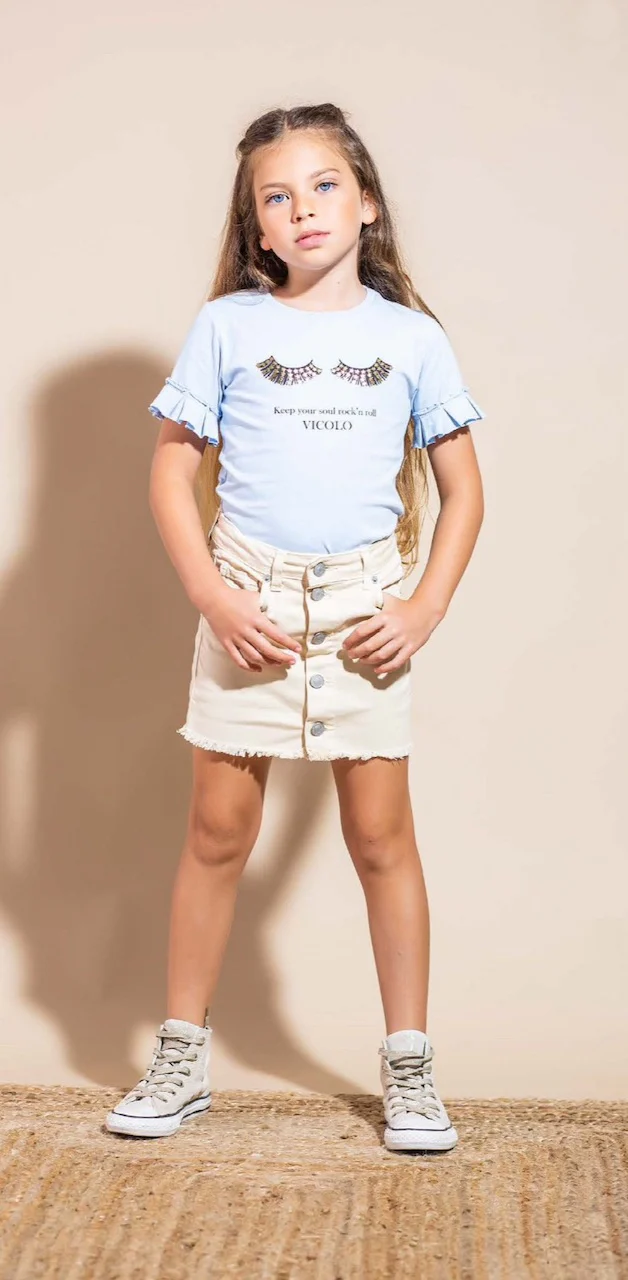 Tshirt bambina Vicolo Girl motivo ciglia con stelline , rouge sulla manica. Composizione Composizione 95% cotone e 5% elastan. Colore Azurro, taglie disponibili 4 anni, 6 anni.